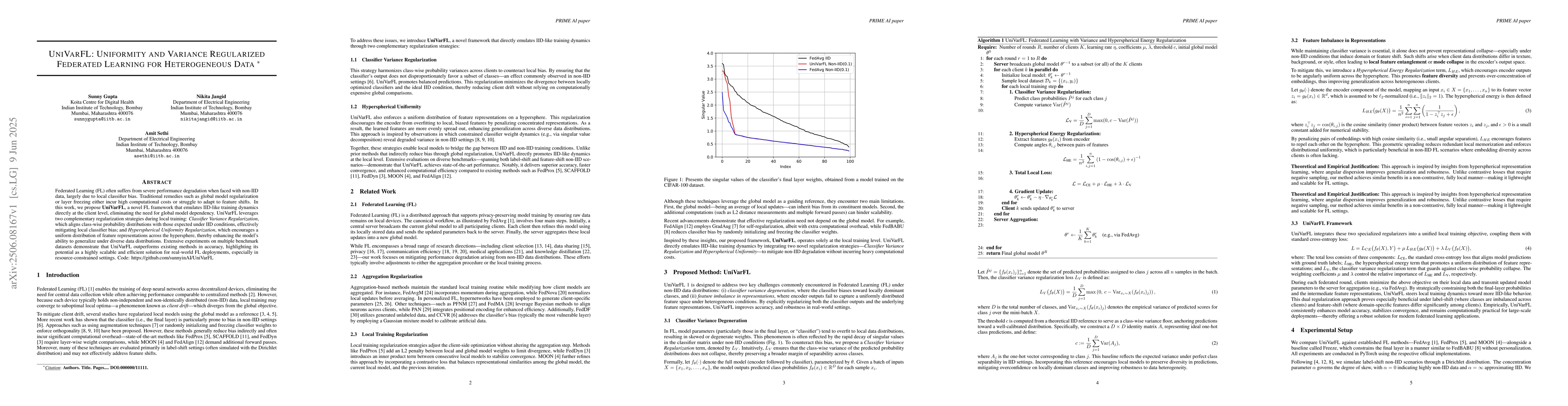 UniVarFL is a federated learning framework addressing non-IID data challenges by employing local Classifier Variance Regularization and Hyperspherical Uniformity Regularization. These strategies reduce local classifier bias and enhance generalization, outperforming existing methods in accuracy across various benchmark datasets.