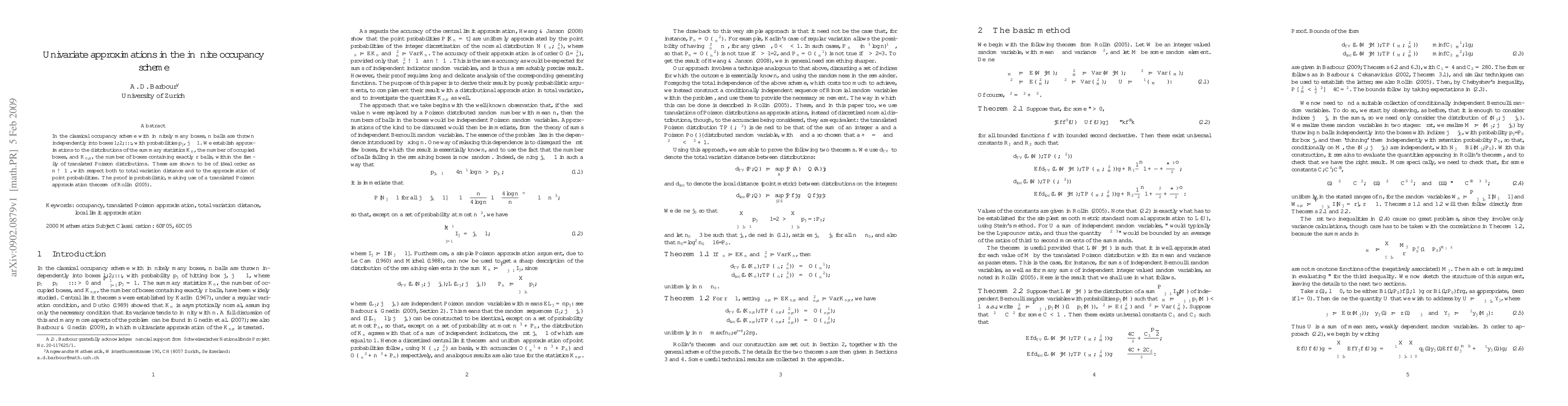 Researchers developed approximations for the number of occupied boxes and boxes with r balls in an infinite occupancy scheme using translated Poisson distributions, achieving ideal asymptotic order for both total variation distance and point probability approximation.