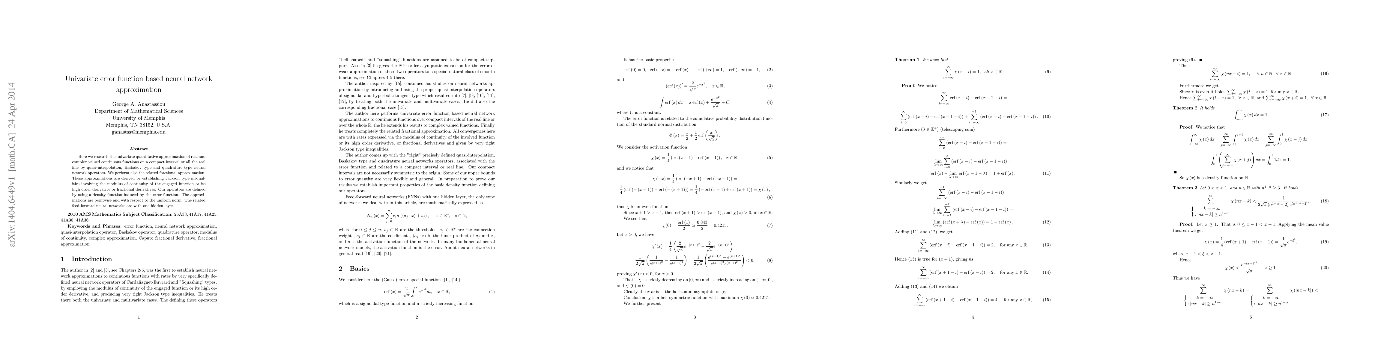 Here we research the univariate quantitative approximation of real and complex valued continuous functions on a compact interval or all the real line by quasi-interpolation, Baskakov type and quadrature type neural network operators. We perform also the related fractional approximation. These approximations are derived by establishing Jackson type inequalities involving the modulus of continuity of the engaged function or its high order derivative or fractional derivatives. Our operators are defined by using a density function induced by the error function. The approximations are pointwise and with respect to the uniform norm. The related feed-forward neural networks are with one hidden layer.