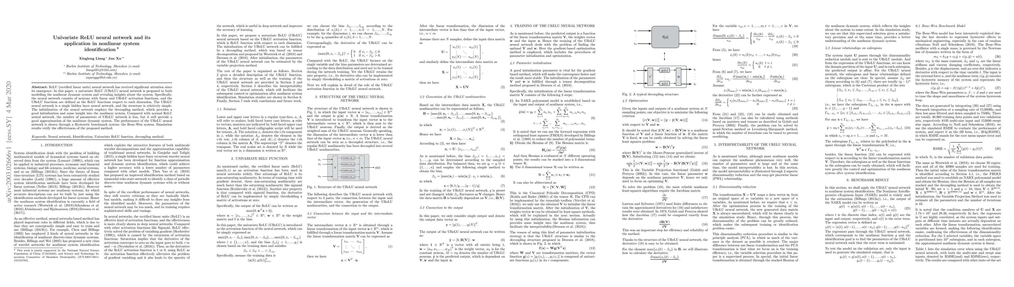 ReLU (rectified linear units) neural network has received significant attention since its emergence. In this paper, a univariate ReLU (UReLU) neural network is proposed to both modelling the nonlinear dynamic system and revealing insights about the system. Specifically, the neural network consists of neurons with linear and UReLU activation functions, and the UReLU functions are defined as the ReLU functions respect to each dimension. The UReLU neural network is a single hidden layer neural network, and the structure is relatively simple. The initialization of the neural network employs the decoupling method, which provides a good initialization and some insight into the nonlinear system. Compared with normal ReLU neural network, the number of parameters of UReLU network is less, but it still provide a good approximation of the nonlinear dynamic system. The performance of the UReLU neural network is shown through a Hysteretic benchmark system: the Bouc-Wen system. Simulation results verify the effectiveness of the proposed method.