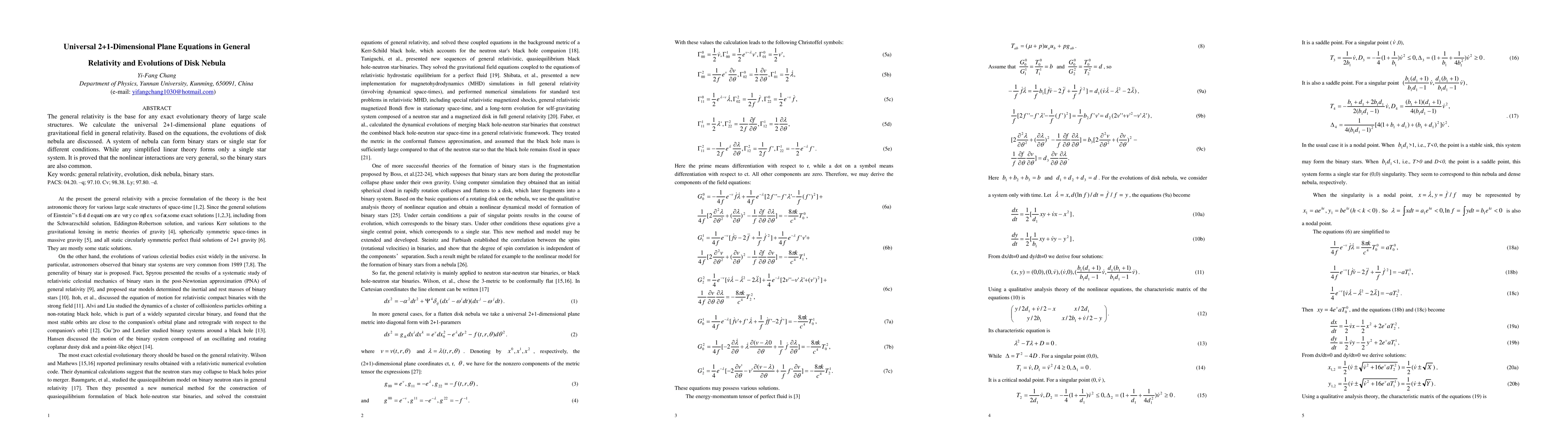 The general relativity is the base for any exact evolutionary theory of large scale structures. We calculate the universal 2+1-dimensional plane equations of gravitational field in general relativity. Based on the equations, the evolutions of disk nebula are discussed. A system of nebula can form binary stars or single star for different conditions. While any simplified linear theory forms only a single star system. It is proved that the nonlinear interactions are very general, so the binary stars are also common.