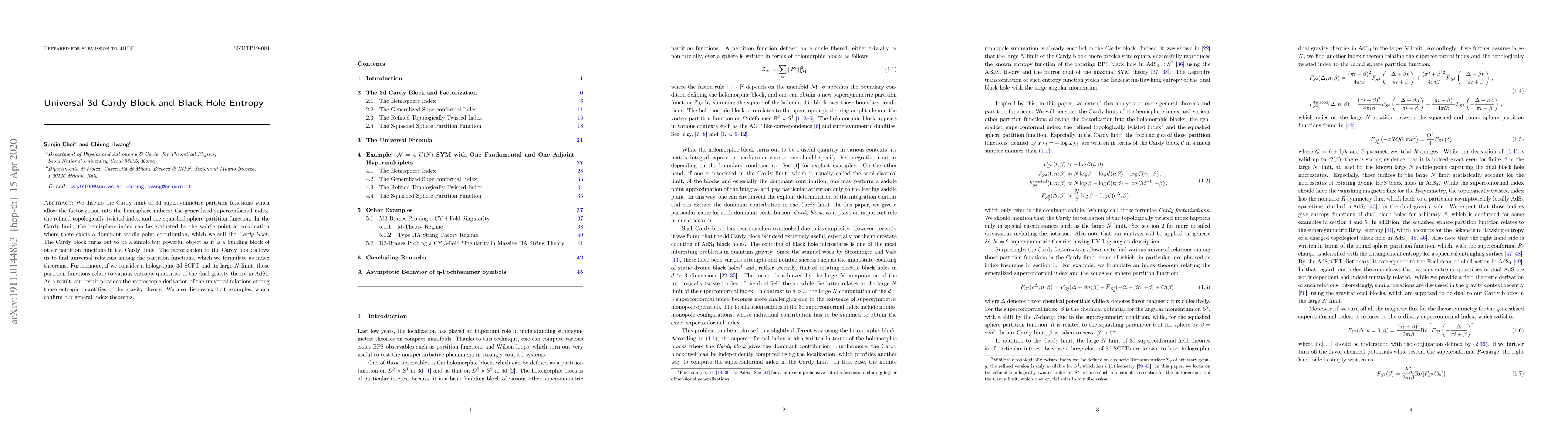 We discuss the Cardy limit of 3d supersymmetric partition functions which allow the factorization into the hemisphere indices: the generalized superconformal index, the refined topologically twisted index and the squashed sphere partition function. In the Cardy limit, the hemisphere index can be evaluated by the saddle point approximation where there exists a dominant saddle point contribution, which we call the Cardy block. The Cardy block turns out to be a simple but powerful object as it is a building block of other partition functions in the Cardy limit. The factorization to the Cardy block allows us to find universal relations among the partition functions, which we formulate as index theorems. Furthermore, if we consider a holographic 3d SCFT and its large $N$ limit, those partition functions relate to various entropic quantities of the dual gravity theory in AdS$_4$. As a result, our result provides the microscopic derivation of the universal relations among those entropic quantities of the gravity theory. We also discuss explicit examples, which confirm our general index theorems.