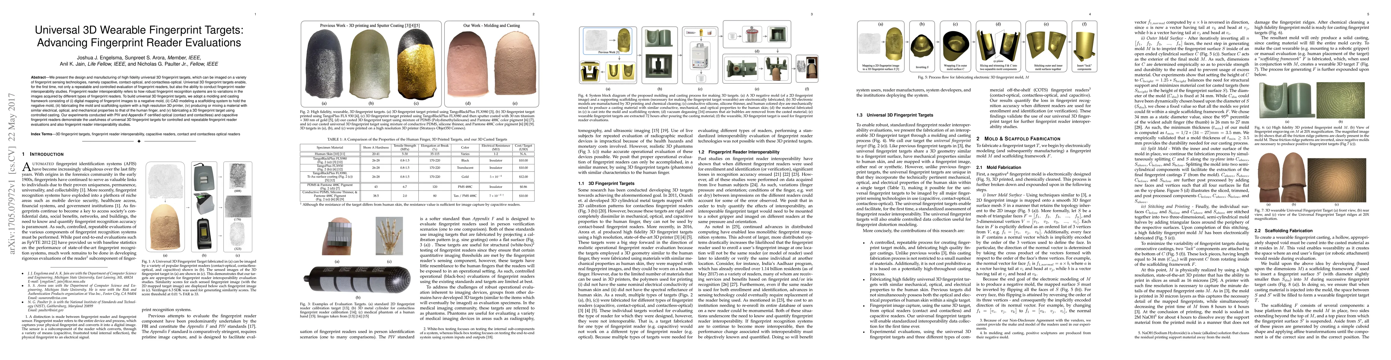 This paper introduces high fidelity universal 3D fingerprint targets designed for evaluating various fingerprint sensing technologies, enabling repeatable and controlled assessments of fingerprint readers. The methodology involves digital mapping, CAD modeling, 3D printing, and material casting, followed by testing with certified optical and capacitive readers to validate the targets' effectiveness.