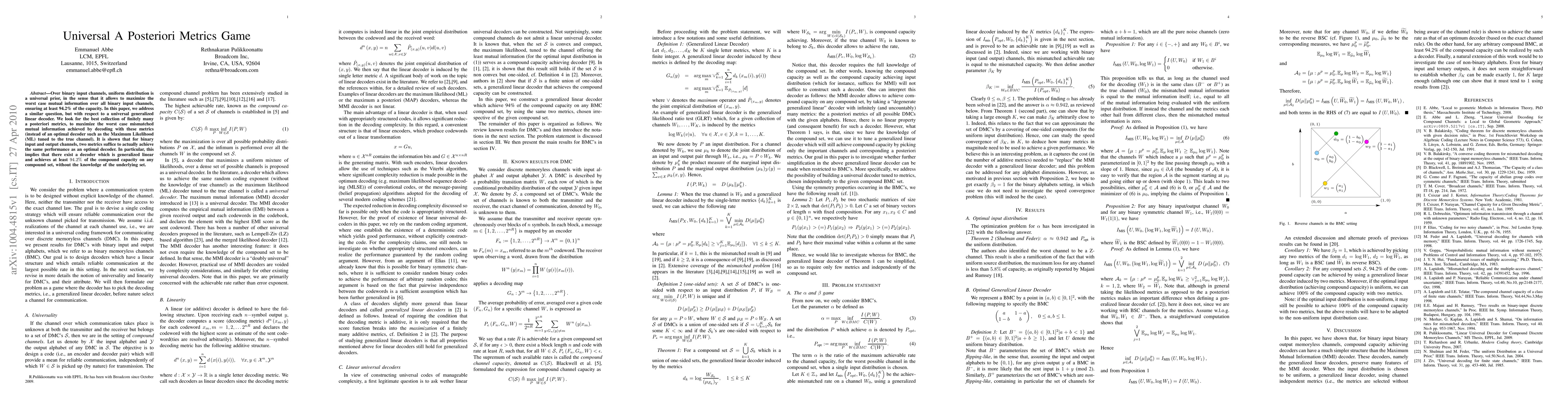 This paper explores the concept of universal a posteriori metrics for binary input channels, demonstrating that only two specific metrics are needed to achieve performance comparable to an optimal decoder. This implies the existence of a generalized linear decoder that can attain at least 94.2% of the compound capacity on any channel set, without prior knowledge of the underlying channel distribution.