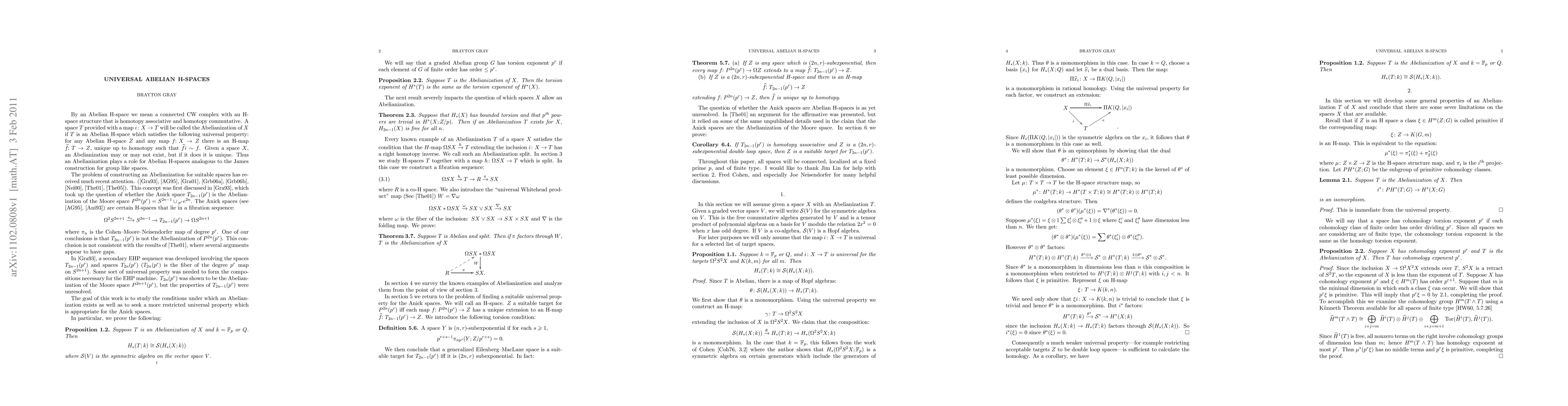 This paper investigates the existence of Universal Abelian H-spaces that uniquely extend maps into homotopy commutative and associative H-spaces. It provides examples of (X,T) pairs and discusses conditions under which such T spaces may exist, while showing that Anick spaces do not universally fulfill this role for Moore spaces.