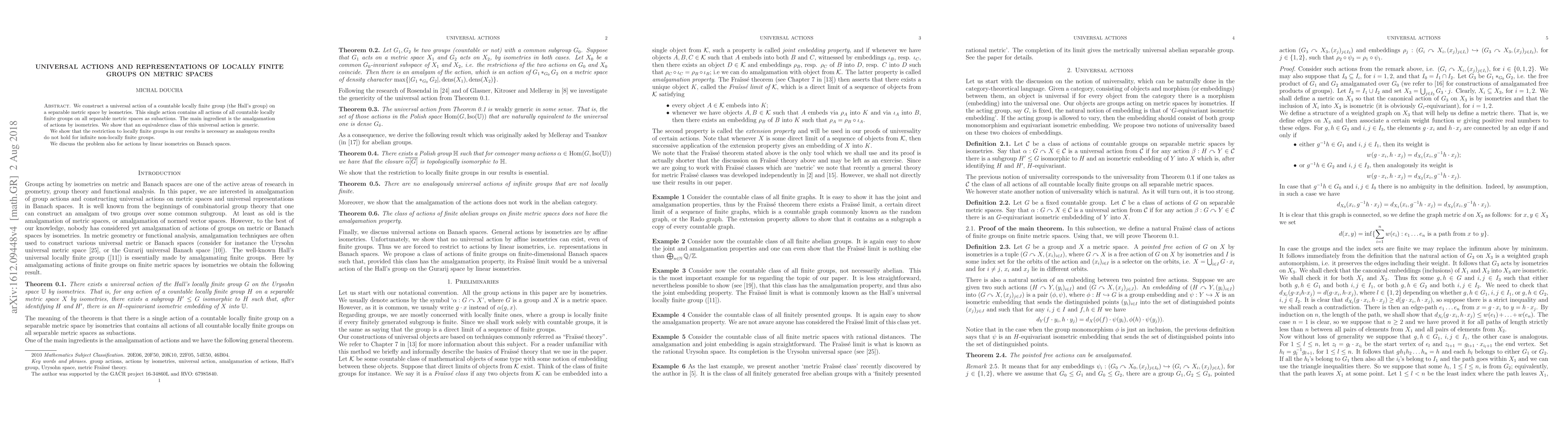 This paper constructs a universal action of the countable locally finite Hall's group on a separable metric space by isometries, showing it encompasses all such actions of countable locally finite groups. The universality and genericity of this action hinge on the amalgamation of isometric actions.