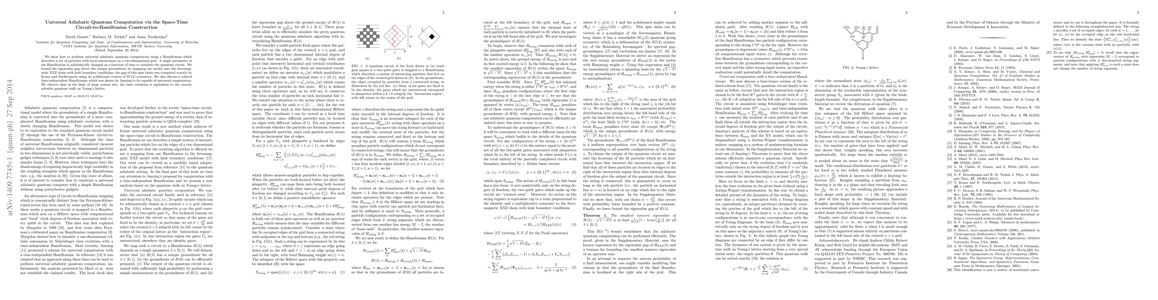 We show how to perform universal adiabatic quantum computation using a Hamiltonian which describes a set of particles with local interactions on a two-dimensional grid. A single parameter in the Hamiltonian is adiabatically changed as a function of time to simulate the quantum circuit. We bound the eigenvalue gap above the unique groundstate by mapping our model onto the ferromagnetic XXZ chain with kink boundary conditions; the gap of this spin chain was computed exactly by Koma and Nachtergaele using its $q$-deformed version of SU(2) symmetry. We also discuss a related time-independent Hamiltonian which was shown by Janzing to be capable of universal computation. We observe that in the limit of large system size, the time evolution is equivalent to the exactly solvable quantum walk on Young's lattice.