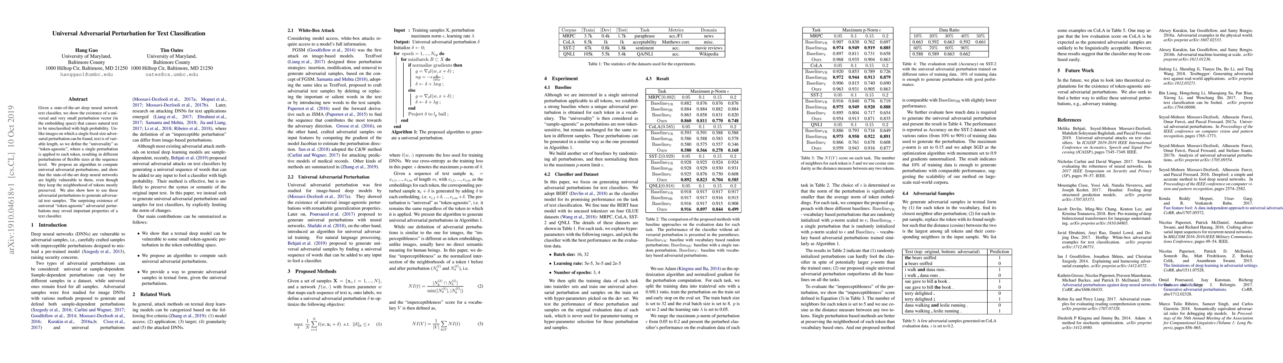 This paper demonstrates the existence of small, universal adversarial perturbations that can misclassify text with high probability, even though they preserve the neighborhood of tokens. Unlike image perturbations, these "token-agnostic" perturbations are applied individually to each token, accommodating variable text lengths.