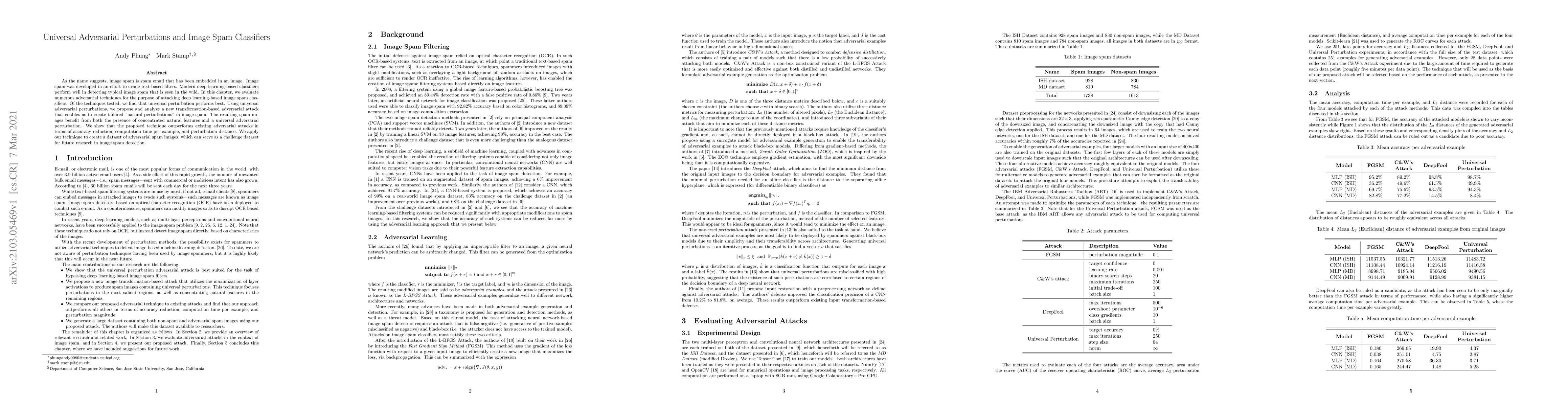 As the name suggests, image spam is spam email that has been embedded in an image. Image spam was developed in an effort to evade text-based filters. Modern deep learning-based classifiers perform well in detecting typical image spam that is seen in the wild. In this chapter, we evaluate numerous adversarial techniques for the purpose of attacking deep learning-based image spam classifiers. Of the techniques tested, we find that universal perturbation performs best. Using universal adversarial perturbations, we propose and analyze a new transformation-based adversarial attack that enables us to create tailored "natural perturbations" in image spam. The resulting spam images benefit from both the presence of concentrated natural features and a universal adversarial perturbation. We show that the proposed technique outperforms existing adversarial attacks in terms of accuracy reduction, computation time per example, and perturbation distance. We apply our technique to create a dataset of adversarial spam images, which can serve as a challenge dataset for future research in image spam detection.