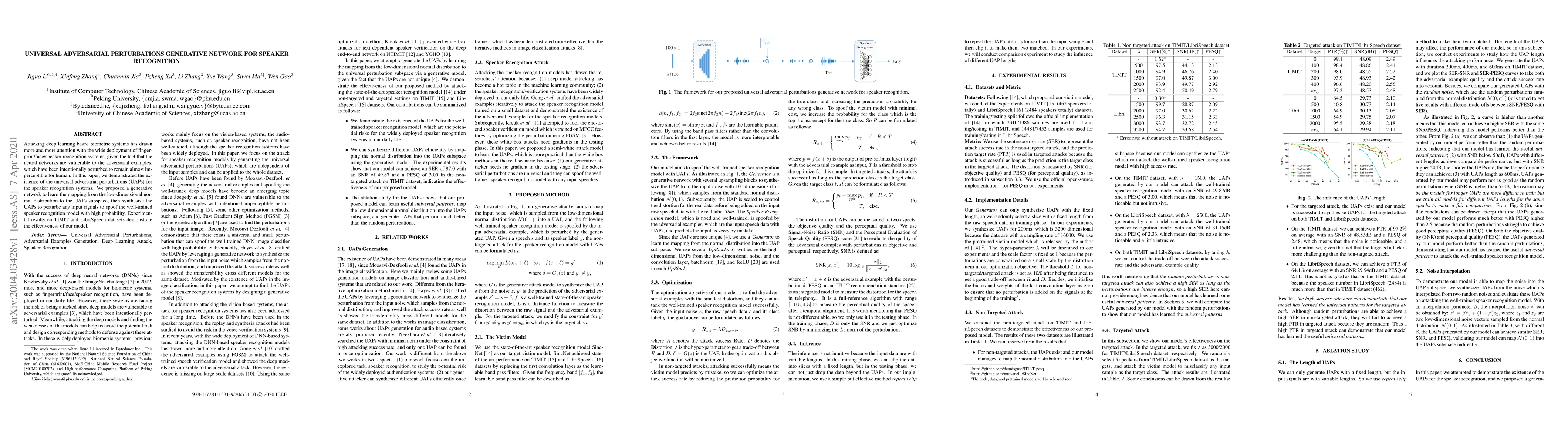Attacking deep learning based biometric systems has drawn more and more attention with the wide deployment of fingerprint/face/speaker recognition systems, given the fact that the neural networks are vulnerable to the adversarial examples, which have been intentionally perturbed to remain almost imperceptible for human. In this paper, we demonstrated the existence of the universal adversarial perturbations~(UAPs) for the speaker recognition systems. We proposed a generative network to learn the mapping from the low-dimensional normal distribution to the UAPs subspace, then synthesize the UAPs to perturbe any input signals to spoof the well-trained speaker recognition model with high probability. Experimental results on TIMIT and LibriSpeech datasets demonstrate the effectiveness of our model.