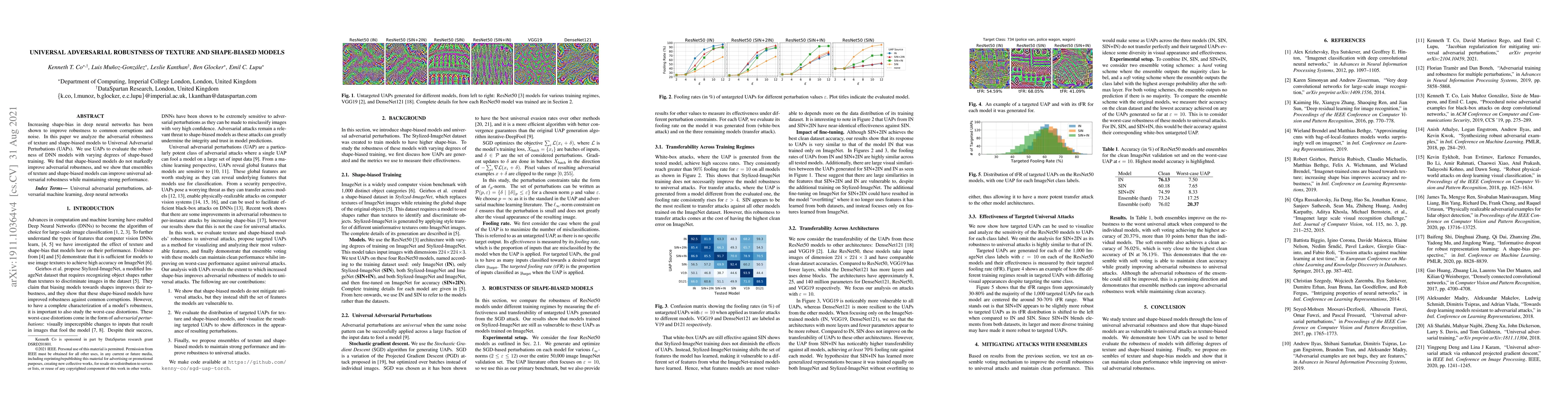 Increasing shape-bias in deep neural networks has been shown to improve robustness to common corruptions and noise. In this paper we analyze the adversarial robustness of texture and shape-biased models to Universal Adversarial Perturbations (UAPs). We use UAPs to evaluate the robustness of DNN models with varying degrees of shape-based training. We find that shape-biased models do not markedly improve adversarial robustness, and we show that ensembles of texture and shape-biased models can improve universal adversarial robustness while maintaining strong performance.