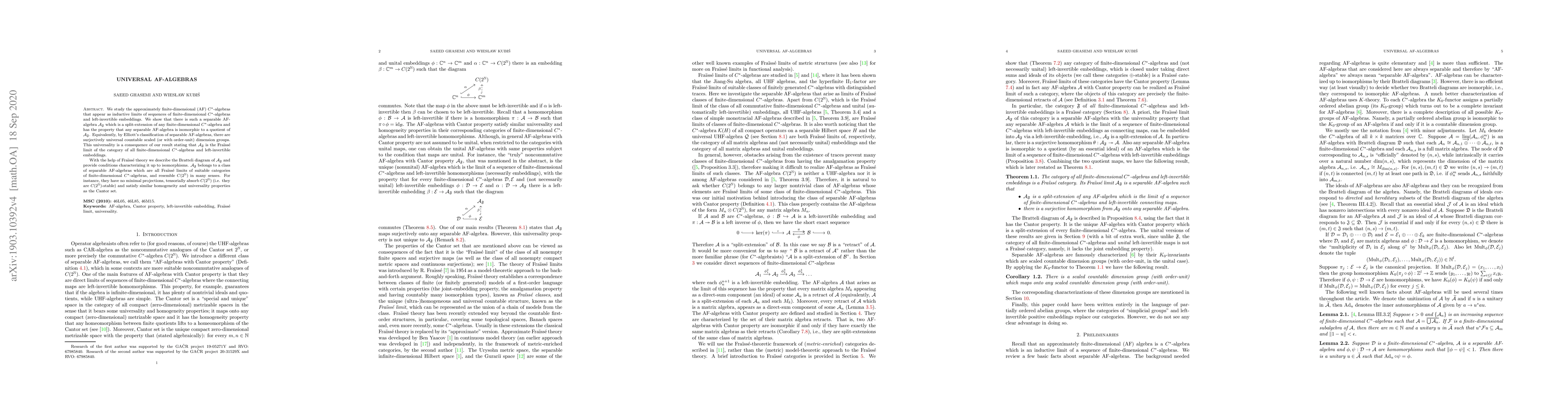 We study the approximately finite-dimensional (AF) $C^*$-algebras that appear as inductive limits of sequences of finite-dimensional $C^*$-algebras and left-invertible embeddings. We show that there is such a separable AF-algebra $\mathcal A_\mathfrak{F}$ with the property that any separable AF-algebra is isomorphic to a quotient of $\mathcal A_\mathfrak{F}$. Equivalently, by Elliott's classification of separable AF-algebras, there are surjectively universal countable scaled (or with order-unit) dimension groups. This universality is a consequence of our result stating that $\mathcal A_\mathfrak{F}$ is the Fra\"\i ss\'e limit of the category of all finite-dimensional $C^*$-algebras and left-invertible embeddings. With the help of Fra\"\i ss\'e theory we describe the Bratteli diagram of $\mathcal A_\mathfrak{F}$ and provide conditions characterizing it up to isomorphisms. $\mathcal A_\mathfrak{F}$ belongs to a class of separable AF-algebras which are all Fra\"\i ss\'e limits of suitable categories of finite-dimensional $C^*$-algebras, and resemble $C(2^\mathbb N)$ in many senses. For instance, they have no minimal projections, tensorially absorb $C(2^\mathbb N)$ (i.e. they are $C(2^\mathbb N)$-stable) and satisfy similar homogeneity and universality properties as the Cantor set.