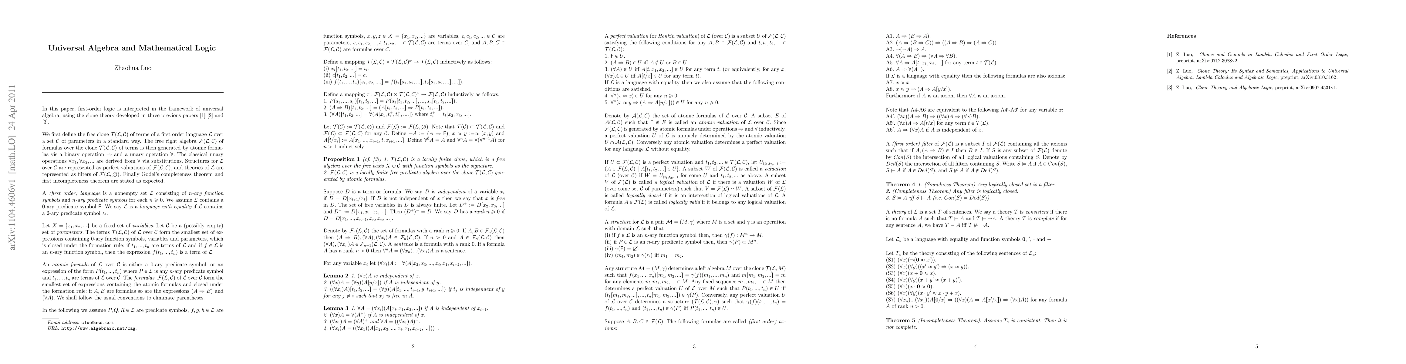 This paper interprets first-order logic within universal algebra, utilizing clone theory to define the free clone and the free right algebra of formulas. It represents structures and theories through perfect valuations and filters, respectively, and discusses Gödel's completeness and incompleteness theorems.
