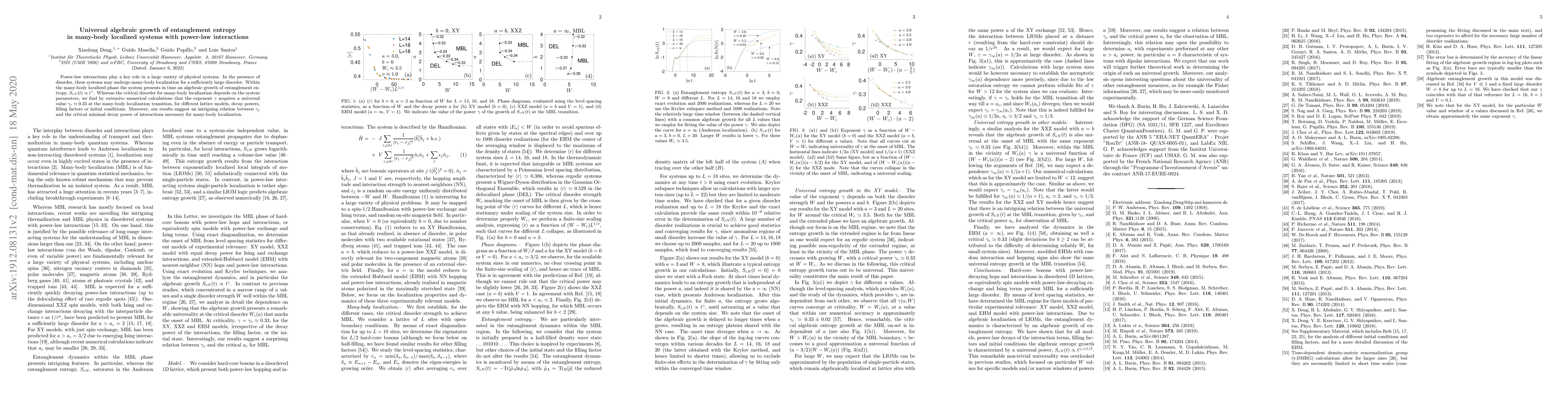 This paper investigates the entanglement entropy growth in many-body localized systems with power-law interactions, finding that the entanglement entropy exhibits universal algebraic growth with an exponent $\gamma_c \approx 0.33$ at the many-body localization transition, regardless of the specific lattice model or interaction decay power.