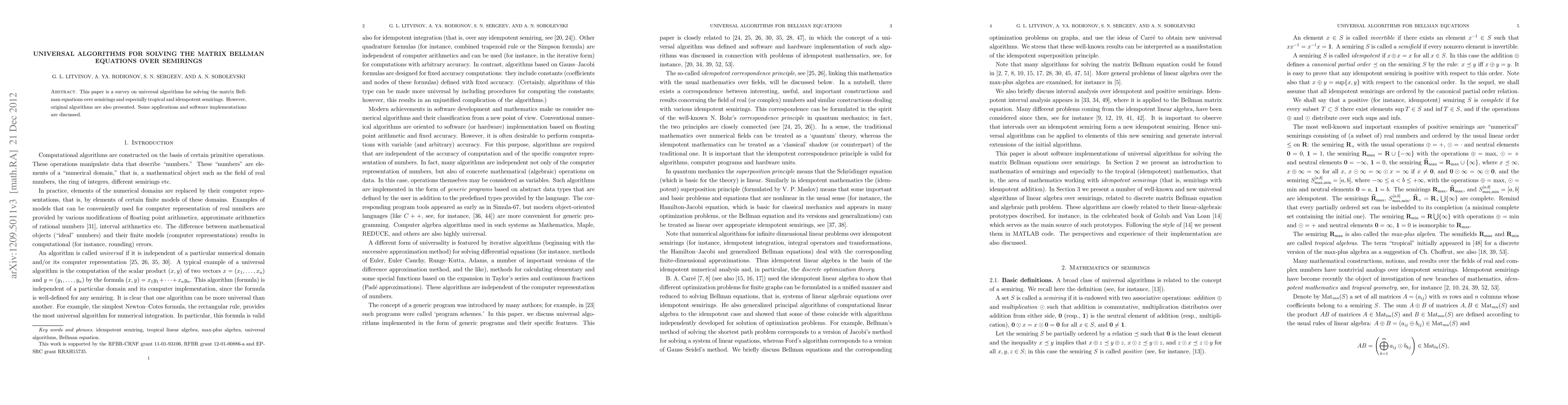 This paper surveys universal algorithms for solving matrix Bellman equations over semirings, particularly focusing on tropical and idempotent semirings, and introduces new algorithms with discussions on applications and software implementations.