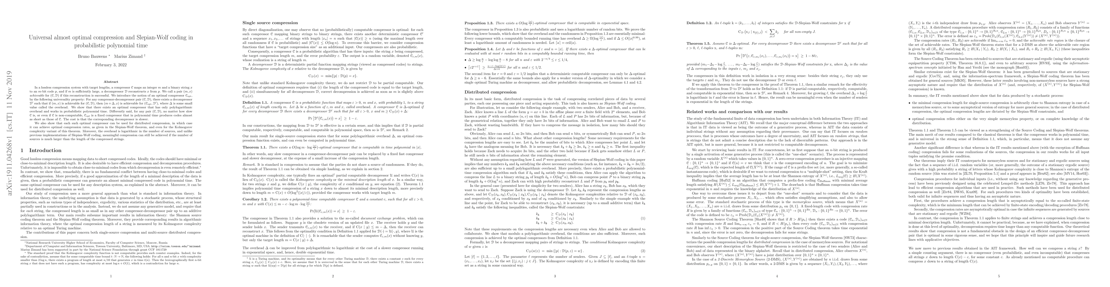 In a lossless compression system with target lengths, a compressor ${\cal C}$ maps an integer $m$ and a binary string $x$ to an $m$-bit code $p$, and if $m$ is sufficiently large, a decompressor ${\cal D}$ reconstructs $x$ from $p$. We call a pair $(m,x)$ $\textit{achievable}$ for $({\cal C},{\cal D})$ if this reconstruction is successful. We introduce the notion of an optimal compressor ${\cal C}_\text{opt}$, by the following universality property: For any compressor-decompressor pair $({\cal C}, {\cal D})$, there exists a decompressor ${\cal D}'$ such that if $(m,x)$ is achievable for $({\cal C},{\cal D})$, then $(m+\Delta, x)$ is achievable for $({\cal C}_\text{opt}, {\cal D}')$, where $\Delta$ is some small value called the overhead. We show that there exists an optimal compressor that has only polylogarithmic overhead and works in probabilistic polynomial time. Differently said, for any pair $({\cal C}, {\cal D})$, no matter how slow ${\cal C}$ is, or even if ${\cal C}$ is non-computable, ${\cal C}_{\text{opt}}$ is a fixed compressor that in polynomial time produces codes almost as short as those of ${\cal C}$. The cost is that the corresponding decompressor is slower. We also show that each such optimal compressor can be used for distributed compression, in which case it can achieve optimal compression rates, as given in the Slepian-Wolf theorem, and even for the Kolmogorov complexity variant of this theorem. Moreover, the overhead is logarithmic in the number of sources, and unlike previous implementations of Slepian-Wolf coding, meaningful compression can still be achieved if the number of sources is much larger than the length of the compressed strings.