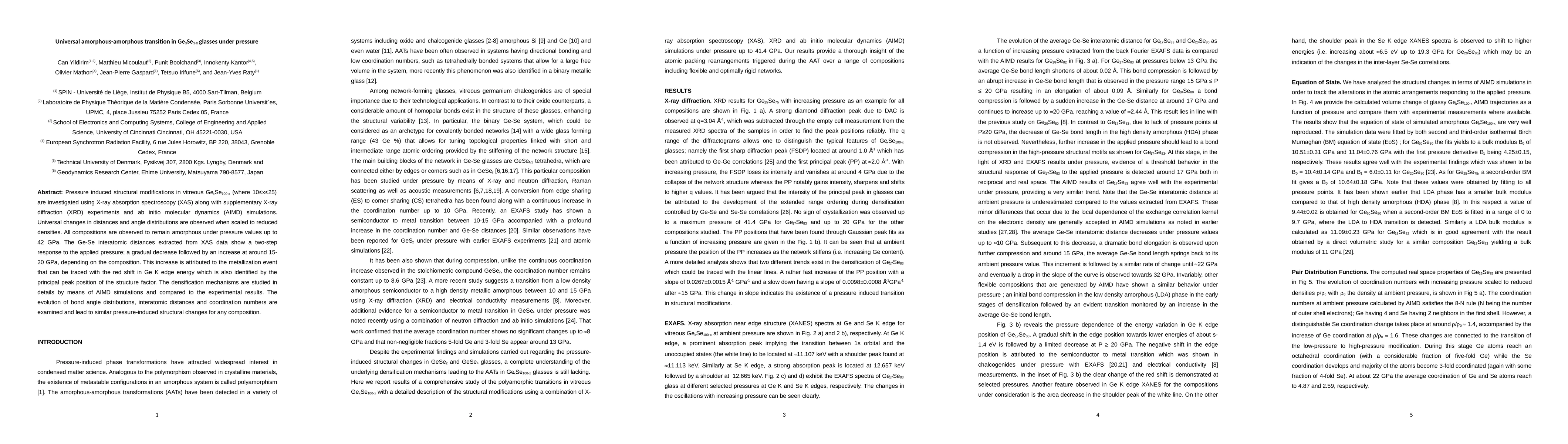This study explores pressure-induced structural changes in Ge-Se glasses using X-ray absorption spectroscopy, X-ray diffraction, and ab initio molecular dynamics simulations. Key findings reveal a universal amorphous-amorphous transition under pressure up to 42 GPa, with Ge-Se distances initially decreasing then increasing due to metallization. Detailed simulations confirm similar pressure-induced structural changes across all compositions.