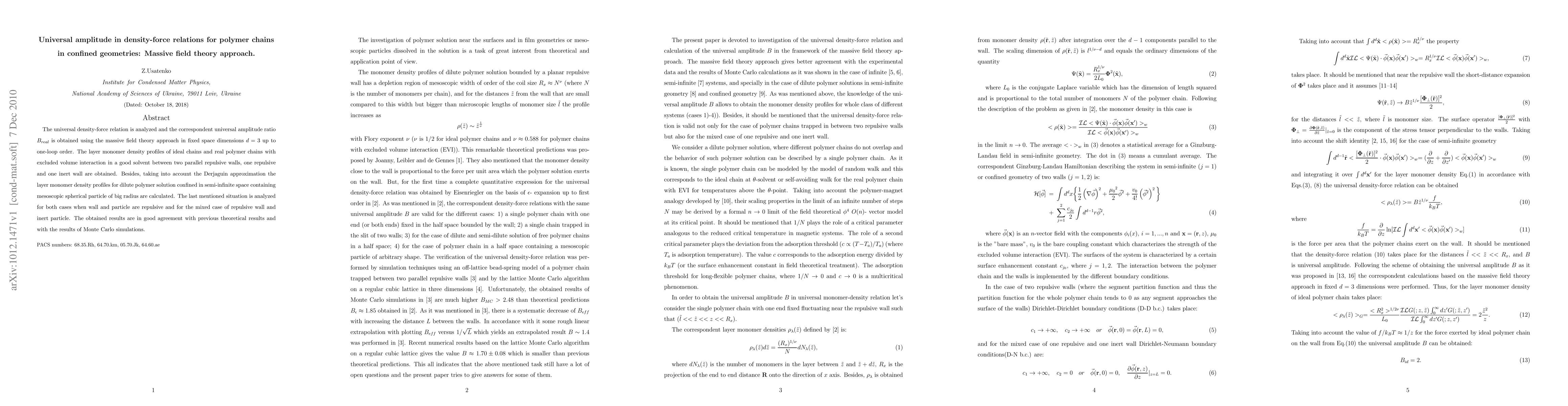 The universal density-force relation is analyzed and the correspondent universal amplitude ratio $B_{real}$ is obtained using the massive field theory approach in fixed space dimensions d=3 up to one-loop order. The layer monomer density profiles of ideal chains and real polymer chains with excluded volume interaction in a good solvent between two parallel repulsive walls, one repulsive and one inert wall are obtained. Besides, taking into account the Derjaguin approximation the layer monomer density profiles for dilute polymer solution confined in semi-infinite space containing mesoscopic spherical particle of big radius are calculated. The last mentioned situation is analyzed for both cases when wall and particle are repulsive and for the mixed case of repulsive wall and inert particle. The obtained results are in good agreement with previous theoretical results and with the results of Monte Carlo simulations.