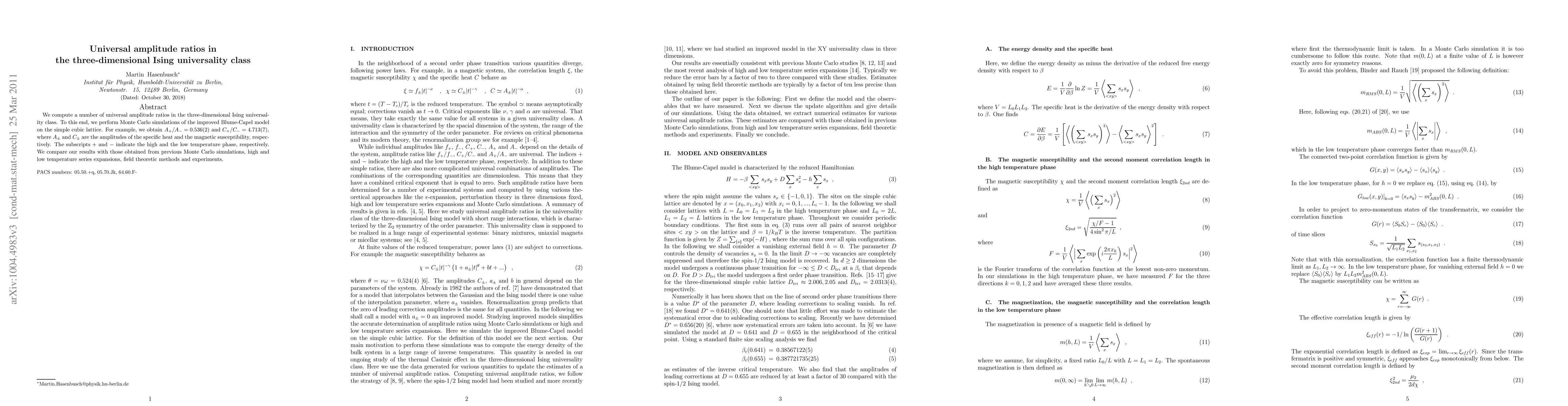 This paper reports on Monte Carlo simulations of the 3D Ising universality class using the improved Blume-Capel model, yielding precise universal amplitude ratios such as A_+/A_-=0.536(2) and C_+/C_-=4.713(7). The results are compared with previous studies to validate the accuracy and consistency of the findings.