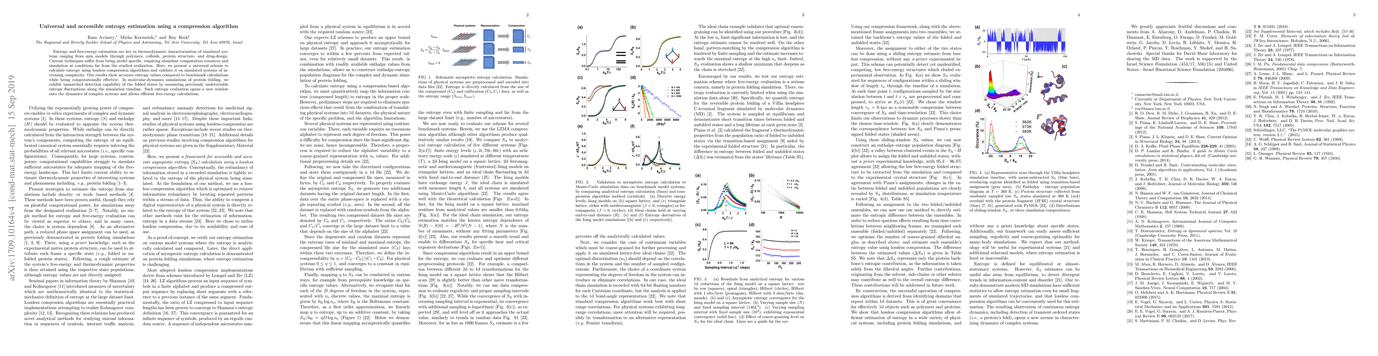 Entropy and free-energy estimation are key in thermodynamic characterization of simulated systems ranging from spin models through polymers, colloids, protein structure, and drug-design. Current techniques suffer from being model specific, requiring abundant computation resources and simulation at conditions far from the studied realization. Here, we present a universal scheme to calculate entropy using lossless compression algorithms and validate it on simulated systems of increasing complexity. Our results show accurate entropy values compared to benchmark calculations while being computationally effective. In molecular-dynamics simulations of protein folding, we exhibit unmatched detection capability of the folded states by measuring previously undetectable entropy fluctuations along the simulation timeline. Such entropy evaluation opens a new window onto the dynamics of complex systems and allows efficient free-energy calculations.