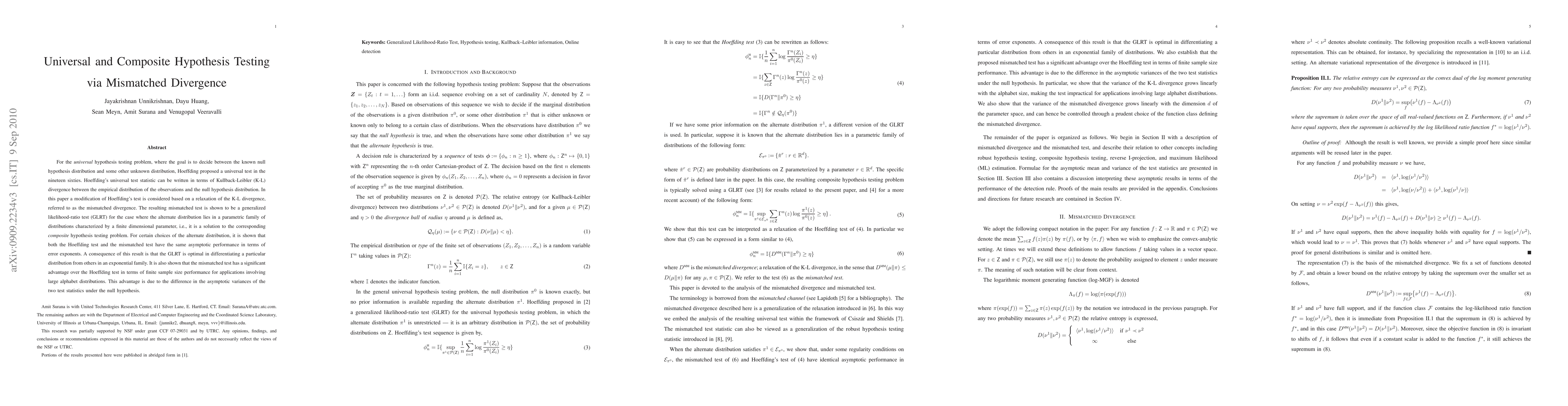 For the universal hypothesis testing problem, where the goal is to decide between the known null hypothesis distribution and some other unknown distribution, Hoeffding proposed a universal test in the nineteen sixties. Hoeffding's universal test statistic can be written in terms of Kullback-Leibler (K-L) divergence between the empirical distribution of the observations and the null hypothesis distribution. In this paper a modification of Hoeffding's test is considered based on a relaxation of the K-L divergence test statistic, referred to as the mismatched divergence. The resulting mismatched test is shown to be a generalized likelihood-ratio test (GLRT) for the case where the alternate distribution lies in a parametric family of the distributions characterized by a finite dimensional parameter, i.e., it is a solution to the corresponding composite hypothesis testing problem. For certain choices of the alternate distribution, it is shown that both the Hoeffding test and the mismatched test have the same asymptotic performance in terms of error exponents. A consequence of this result is that the GLRT is optimal in differentiating a particular distribution from others in an exponential family. It is also shown that the mismatched test has a significant advantage over the Hoeffding test in terms of finite sample size performance. This advantage is due to the difference in the asymptotic variances of the two test statistics under the null hypothesis. In particular, the variance of the K-L divergence grows linearly with the alphabet size, making the test impractical for applications involving large alphabet distributions. The variance of the mismatched divergence on the other hand grows linearly with the dimension of the parameter space, and can hence be controlled through a prudent choice of the function class defining the mismatched divergence.