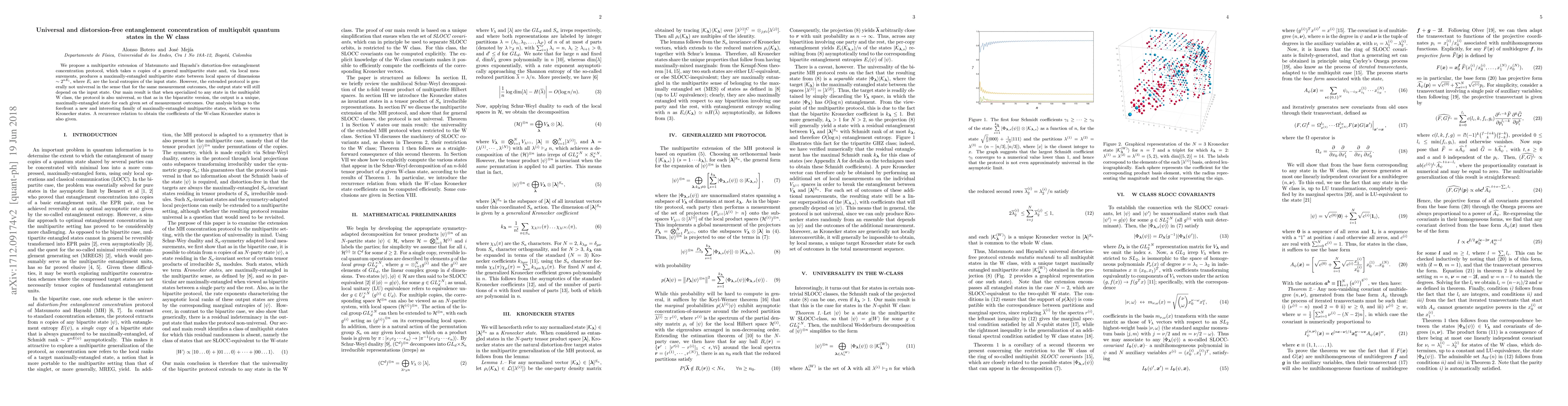 We propose a multipartite extension of Matsumoto and Hayashi's distortion-free entanglement concentration protocol, which takes $n$ copies of a general multipartite state and, via local measurements, produces a maximally-entangled multipartite state between local spaces of dimensions $\sim 2^{n E_i}$, where $E_i$ are the local entropies of the input state. However, the extended protocol is generally not universal in the sense that for the same measurement outcomes, the output state will still depend on the input state. Our main result is that when specialized to any state in the multiqubit W class, the protocol is also universal, so that as in the biparatite version, the output is a unique, maximally-entangled state for each given set of measurement outcomes. Our analysis brings to the forefront a new and interesting family of maximally-entangled multipartite states, which we term Kronecker states. A recurrence relation to obtain the coefficients of the W-class Kronecker states is also given.