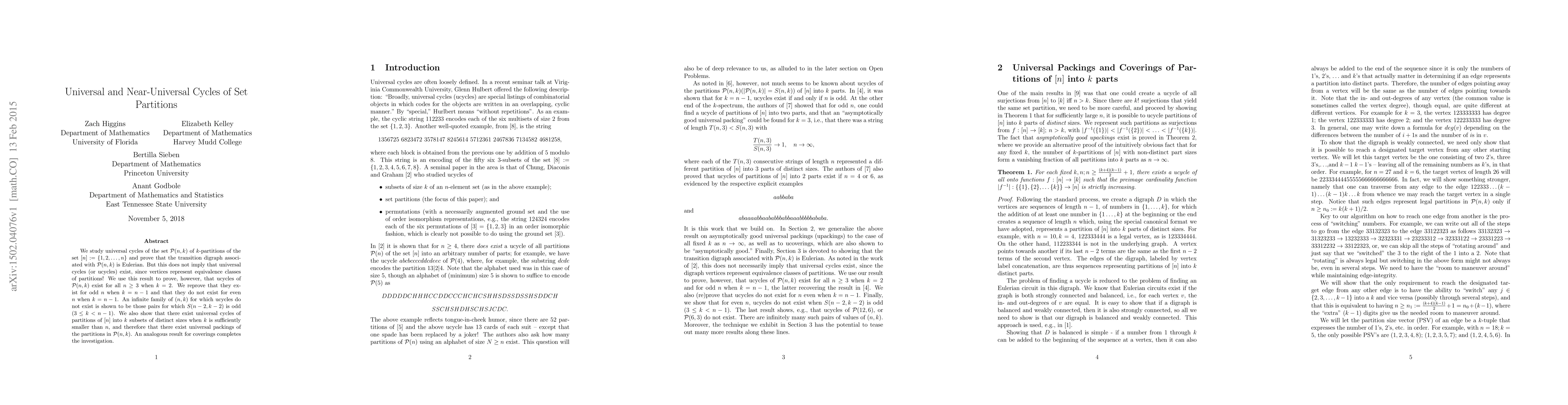 This paper investigates universal cycles in set partitions, proving that the transition digraph for $k$-partitions of $[n]$ is Eulerian. It establishes the existence of universal cycles for $k=2$ when $n \geq 3$ and for odd $n$ when $k=n-1$, while showing they do not exist for even $n$ under the same conditions.