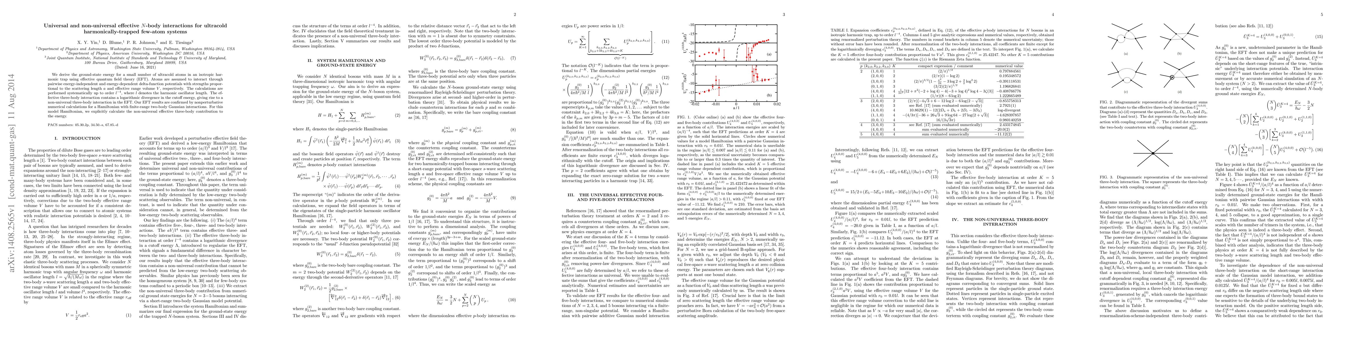 This paper derives the ground-state energy for ultracold, few-atom systems in a harmonic trap using effective quantum field theory, revealing both universal and non-universal $N$-body interactions. It confirms the presence of a logarithmic divergence in the effective three-body interaction, leading to a non-universal contribution, corroborated by numerical simulations.