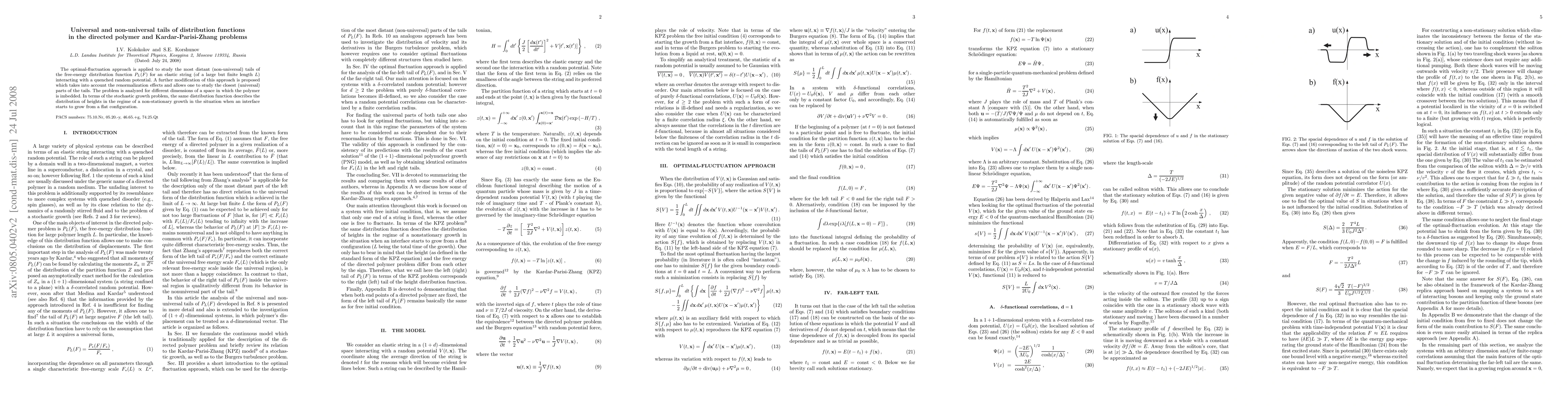 The optimal fluctuation approach is applied to study the most distant (non-universal) tails of the free-energy distribution function P(F) for an elastic string (of a large but finite length L) interacting with a quenched random potential. A further modification of this approach is proposed which takes into account the renormalization effects and allows one to study the most close (universal) parts of the tails. The problem is analyzed for different dimensions of a space in which the polymer is imbedded. In terms the stochastic growth problem, the same distribution function describes the distribution of heights in the regime of a non-stationary growth in a situation when an interface starts to grow from a flat configuration.