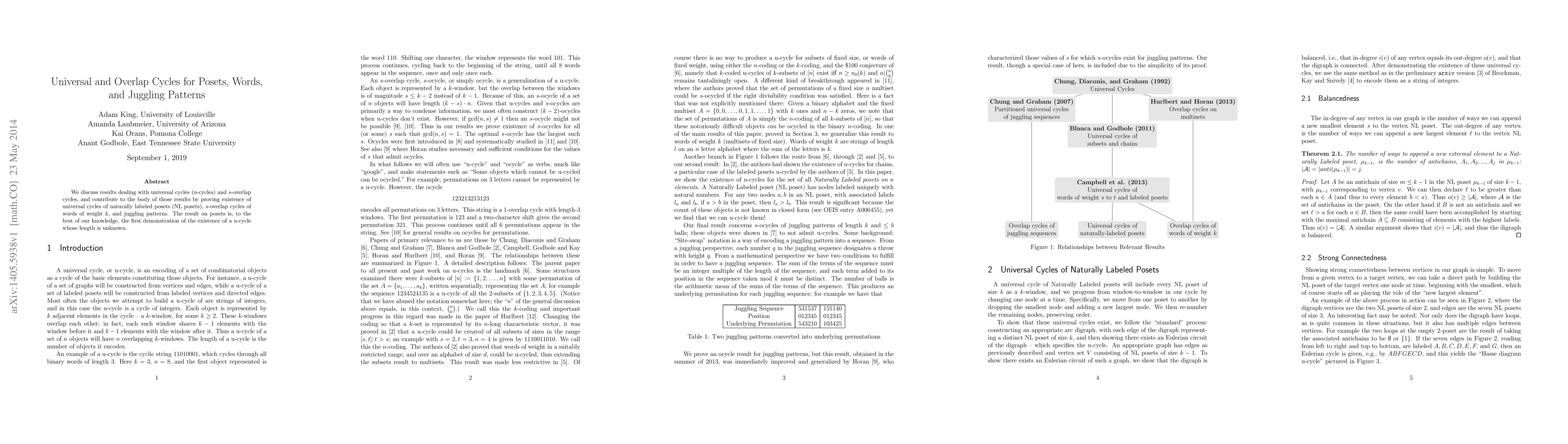 We discuss results dealing with universal cycles (u-cycles) and $s$-overlap cycles, and contribute to the body of those results by proving existence of universal cycles of naturally labeled posets (NL posets), $s$-overlap cycles of words of weight $k$, and juggling patterns. The result on posets is, to the best of our knowledge, the first demonstration of the existence of a u-cycle whose length is unknown.