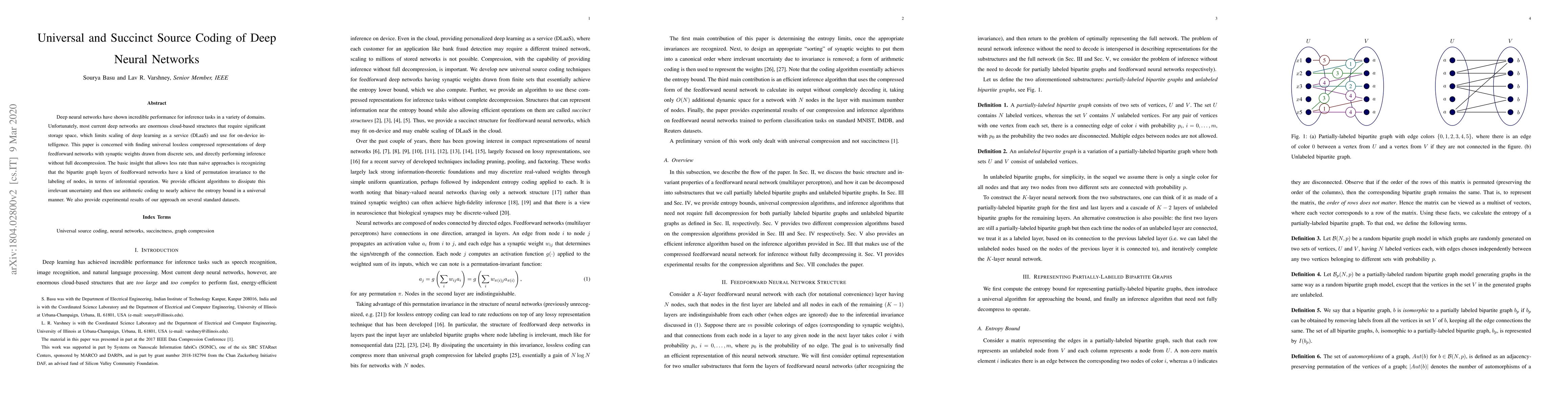 Deep neural networks have shown incredible performance for inference tasks in a variety of domains. Unfortunately, most current deep networks are enormous cloud-based structures that require significant storage space, which limits scaling of deep learning as a service (DLaaS) and use for on-device intelligence. This paper is concerned with finding universal lossless compressed representations of deep feedforward networks with synaptic weights drawn from discrete sets, and directly performing inference without full decompression. The basic insight that allows less rate than naive approaches is recognizing that the bipartite graph layers of feedforward networks have a kind of permutation invariance to the labeling of nodes, in terms of inferential operation. We provide efficient algorithms to dissipate this irrelevant uncertainty and then use arithmetic coding to nearly achieve the entropy bound in a universal manner. We also provide experimental results of our approach on several standard datasets.