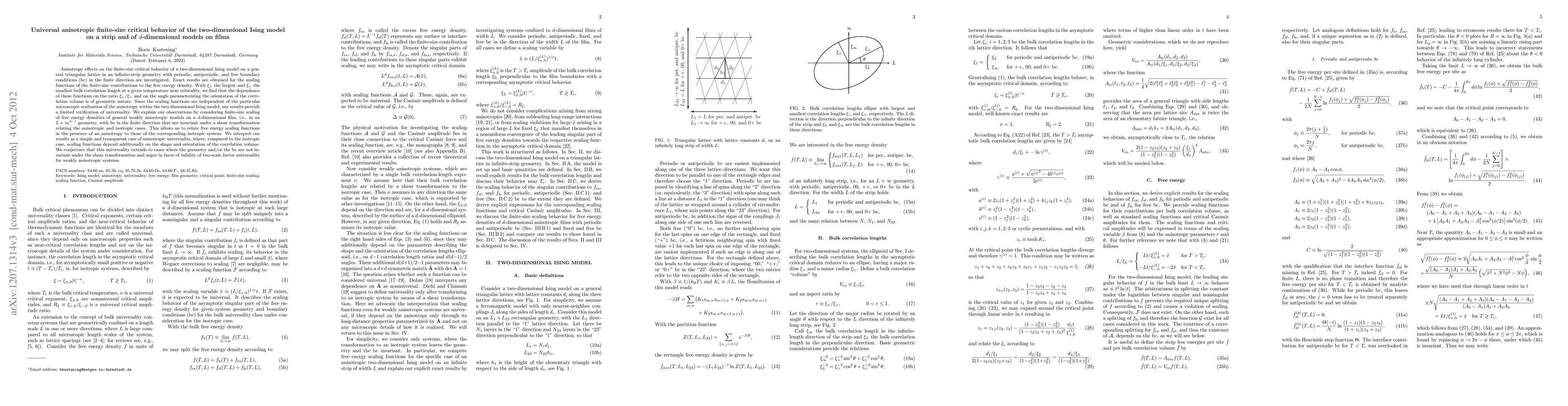 This paper investigates the anisotropic finite-size critical behavior of the two-dimensional Ising model on a strip and generalizes findings to d-dimensional models on films. Exact scaling functions for the free energy density are derived, revealing that the observed anisotropic effects are geometric rather than dynamic, supporting a form of anisotropic universality.