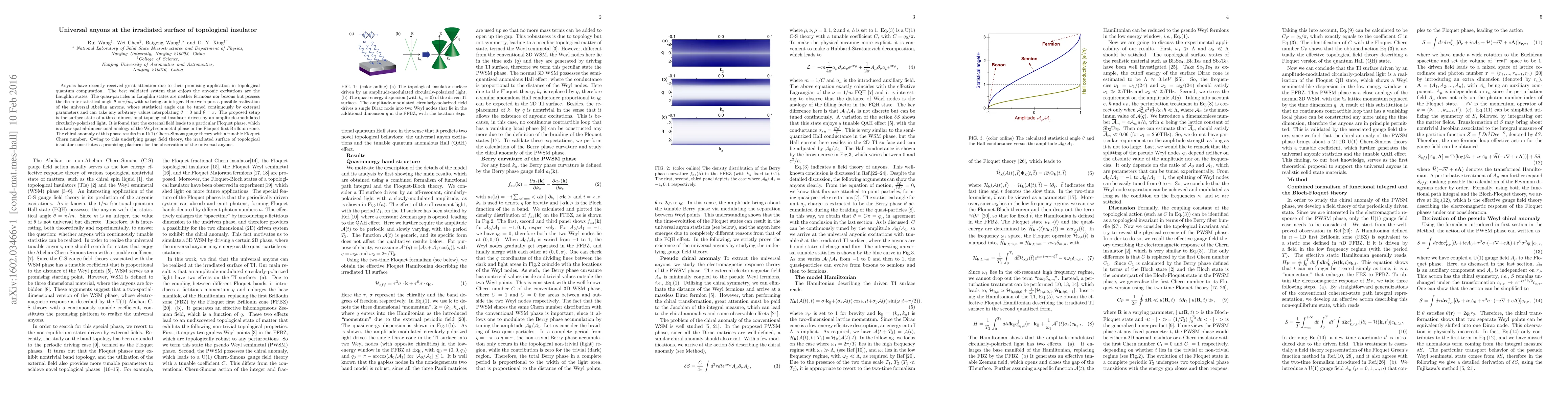 Anyons have recently received great attention due to their promising application in topological quantum computation. The best validated system that enjoys the anyonic excitations are the Laughlin states. The quasi-particles in Laughlin states are neither fermions nor bosons but possess the discrete statistical angle ? = ?=m, with m being an integer. Here we report a possible realization of the universal Abelian anyons, whose statistical angle can be tuned continuously by external parameters and can take any arbitrary values interpolating ? = 0 and ? = ?. The proposed setup is the surface state of a three dimensional topological insulator driven by an amplitude-modulated circularly-polarized light. It is found that the external field leads to a particular Floquet phase, which is a two-spatial-dimensional analogy of the Weyl semimetal phase in the Floquet first Brillouin zone. The chiral anomaly of this phase results in a U(1) Chern-Simons gauge theory with a tunable Floquet Chern number. Owing to this underlying gauge field theory, the irradiated surface of topological insulator constitutes a promising platform for the observation of the universal anyons.