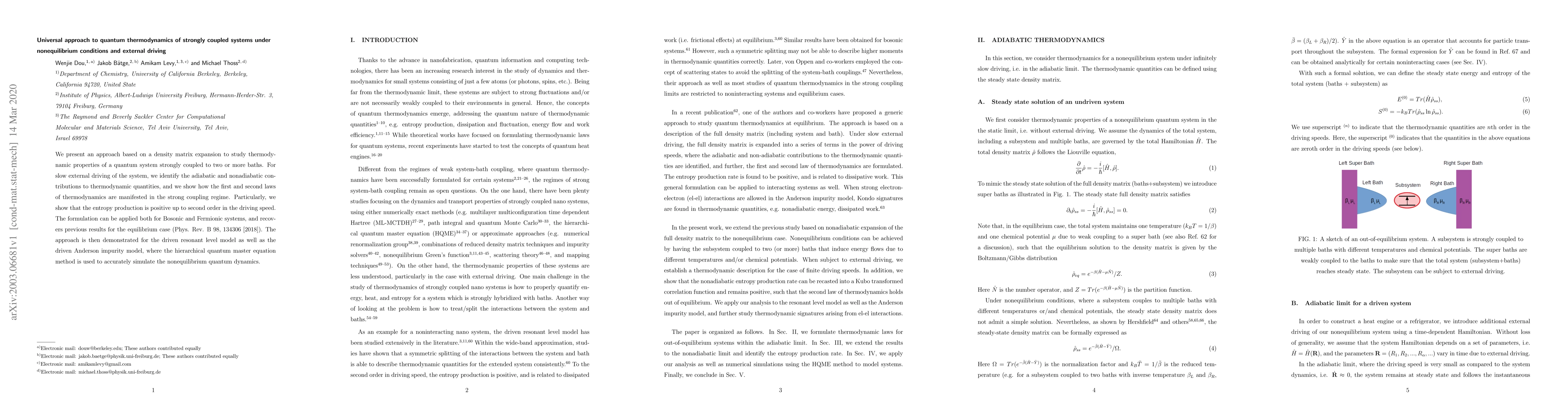 Researchers developed a new approach to study quantum thermodynamics in systems coupled to multiple baths under external driving conditions. They found that entropy production is positive up to second order in the driving speed for both Bosonic and Fermionic systems.