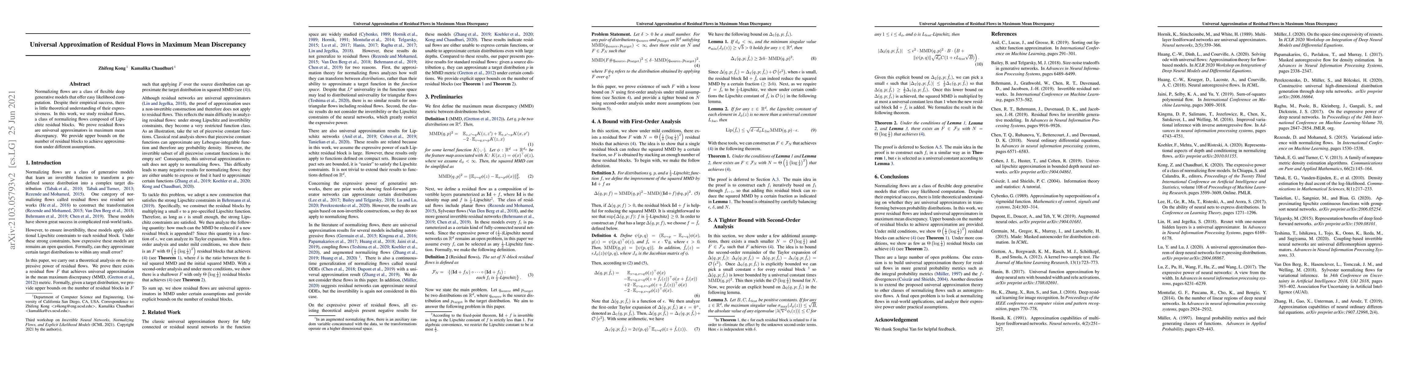 This paper investigates residual flows, a type of normalizing flows with Lipschitz residual blocks, proving their universal approximation capability in maximum mean discrepancy. It also provides upper bounds on the number of residual blocks needed for approximation under various assumptions.