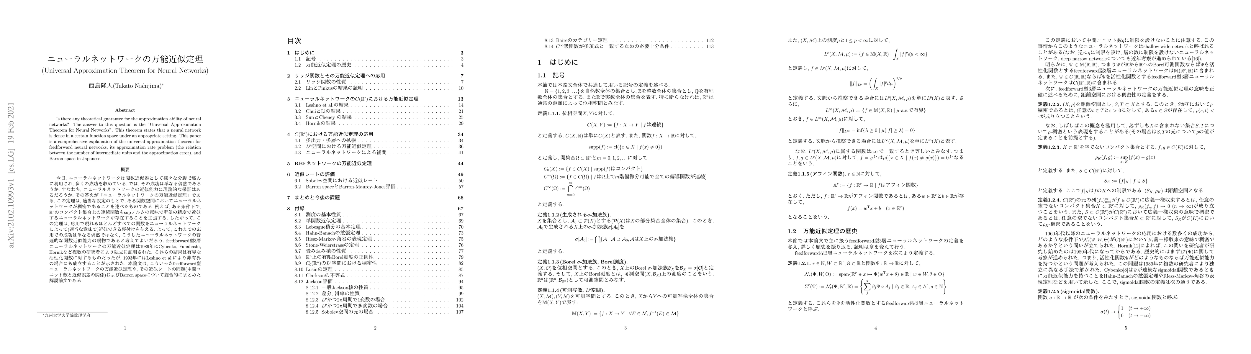 Is there any theoretical guarantee for the approximation ability of neural networks? The answer to this question is the "Universal Approximation Theorem for Neural Networks". This theorem states that a neural network is dense in a certain function space under an appropriate setting. This paper is a comprehensive explanation of the universal approximation theorem for feedforward neural networks, its approximation rate problem (the relation between the number of intermediate units and the approximation error), and Barron space in Japanese.