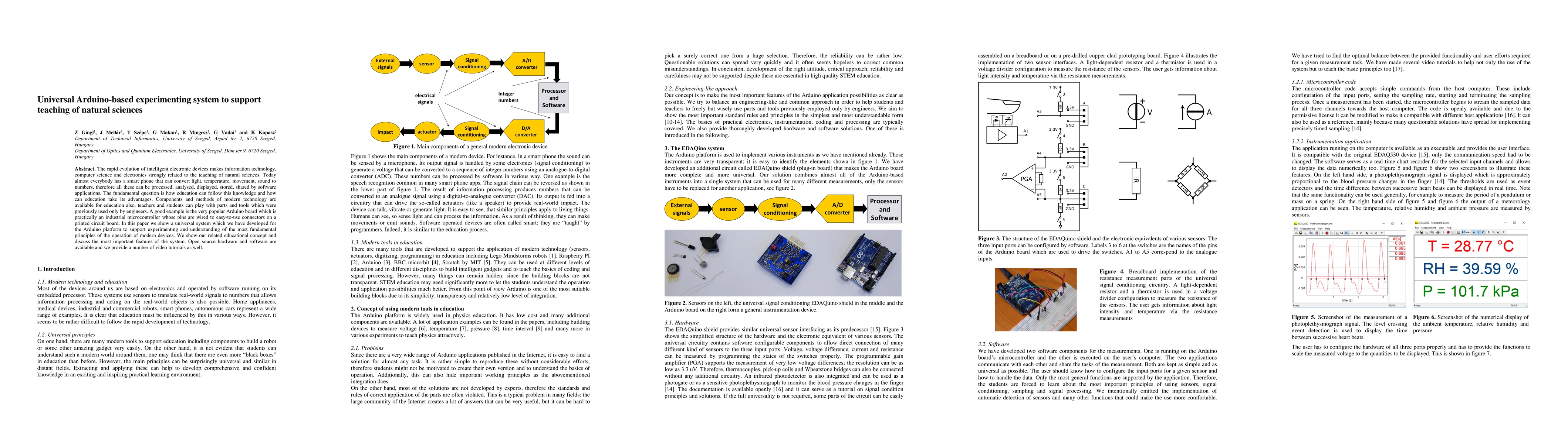 The rapid evolution of intelligent electronic devices makes information technology, computer science and electronics strongly related to the teaching of natural sciences. Today almost everybody has a smart phone that can convert light, temperature, movement, sound to numbers, therefore all these can be processed, analysed, displayed, stored, shared by software applications. The fundamental question is how education can follow this knowledge and how can education take its advantages. Components and methods of modern technology are available for education also, teachers and students can play with parts and tools which were previously used only by engineers. A good example is the very popular Arduino board which is practically an industrial microcontroller whose pins are wired to easy-to-use connectors on a printed circuit board. In this paper we show a universal system which we have developed for the Arduino platform to support experimenting and understanding of the most fundamental principles of the operation of modern devices. We show our related educational concept and discuss the most important features of the system. Open source hardware and software are available and we provide a number of video tutorials as well.