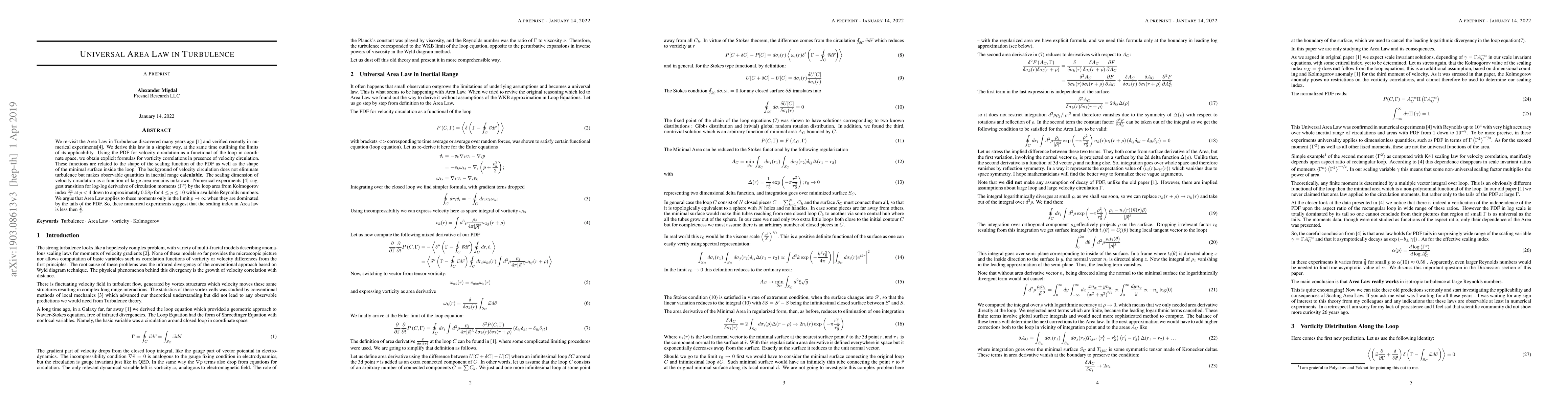 This research re-derives the Area Law in Turbulence, simplifying its explanation and outlining its applicability limits. Using velocity circulation's probability distribution, explicit formulas for vorticity correlations are obtained, revealing a connection to minimal surface shapes. The study finds that a background velocity circulation makes certain observable turbulence quantities calculable in the inertial range. Numerical experiments suggest the scaling index in the Area Law is less than 2/3, indicating a transition in the log-log derivative of circulation moments with loop area.