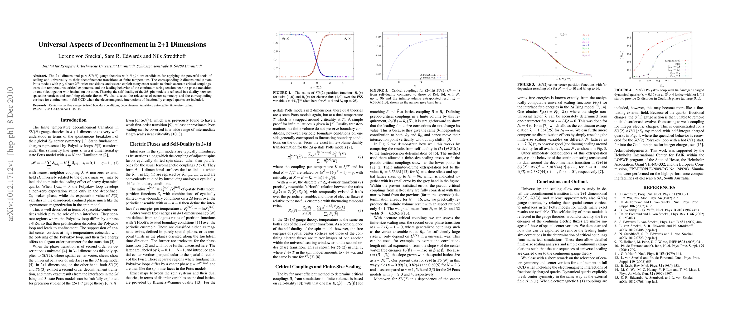 The 2+1 dimensional pure SU(N) gauge theories with N <= 4 are candidates for applying the powerful tools of scaling and universality to their deconfinement transitions at finite temperature. The corresponding 2 dimensional q-state Potts models with q <= 4 have 2nd order transitions, and we can exploit many exact results to obtain accurate critical couplings, transition temperatures, critical exponents, and the leading behavior of the continuum string tension near the phase transition on one side, together with its dual on the other. Thereby, the self-duality of the 2d spin models is reflected in a duality between spacelike vortices and confining electric fluxes. We also discuss the relevance of center symmetry and the corresponding vortices for confinement in full QCD when the electromagnetic interactions of fractionally charged quarks are included.