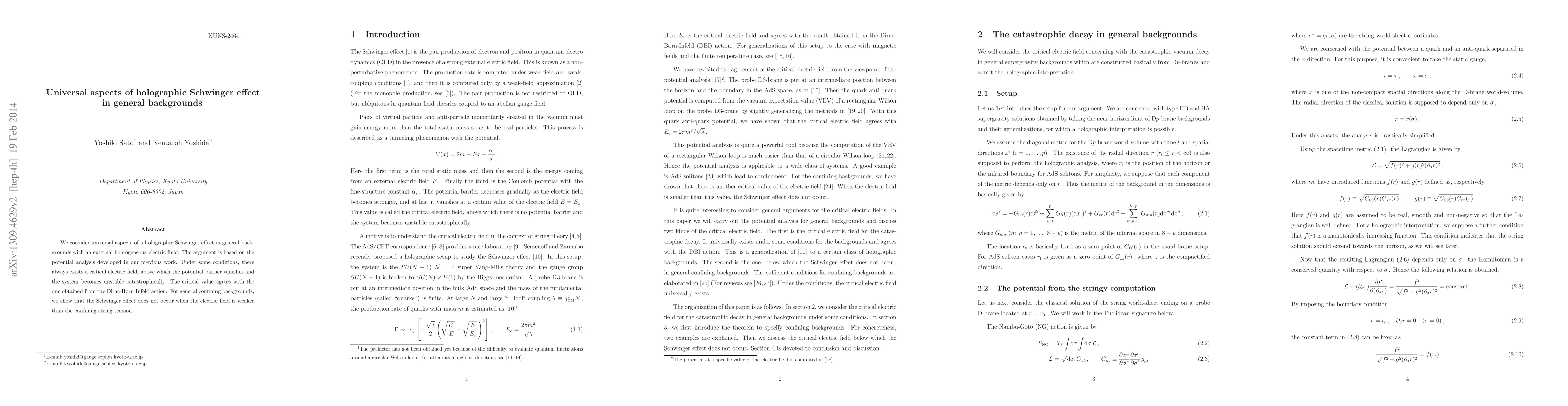 We consider universal aspects of a holographic Schwinger effect in general backgrounds with an external homogeneous electric field. The argument is based on the potential analysis developed in our previous work. Under some conditions, there always exists a critical electric field, above which the potential barrier vanishes and the system becomes unstable catastrophically. The critical value agrees with the one obtained from the Dirac-Born-Infeld action. For general confining backgrounds, we show that the Schwinger effect does not occur when the electric field is weaker than the confining string tension.