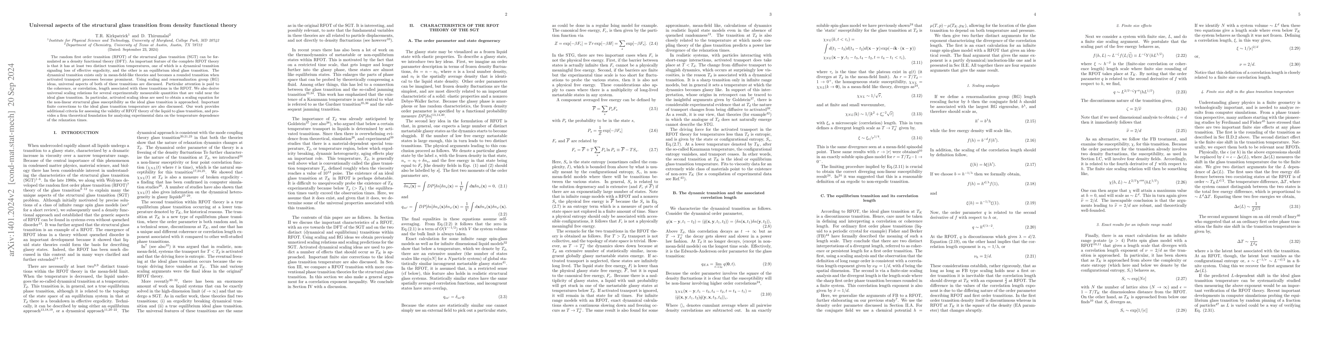 Researchers analyze universal features of the random first order phase transition theory of glass transitions, including two distinct transition temperatures and coherence length, providing a theoretical framework for analyzing experimental data on liquid to glass transitions.