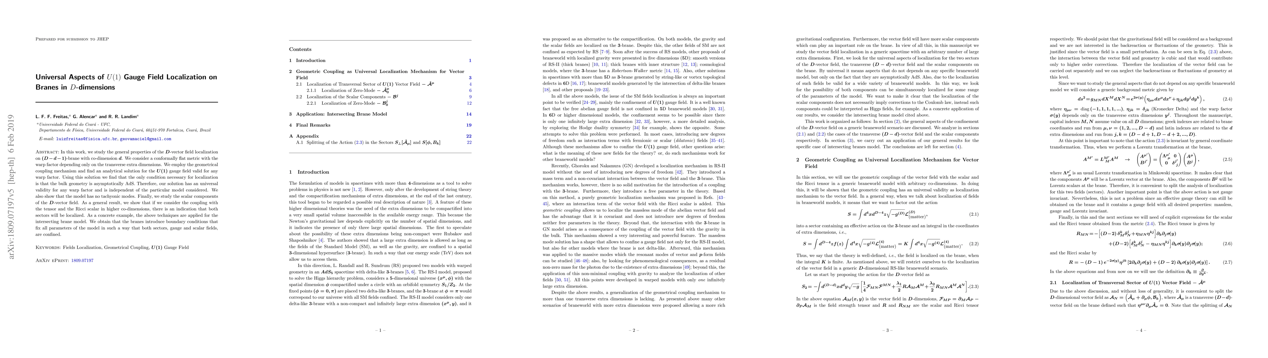 The research paper finds that $U(1)$ gauge field localization on branes in D-dimensions requires only an asymptotically AdS bulk geometry, with no dependence on the specific model or warp factor.