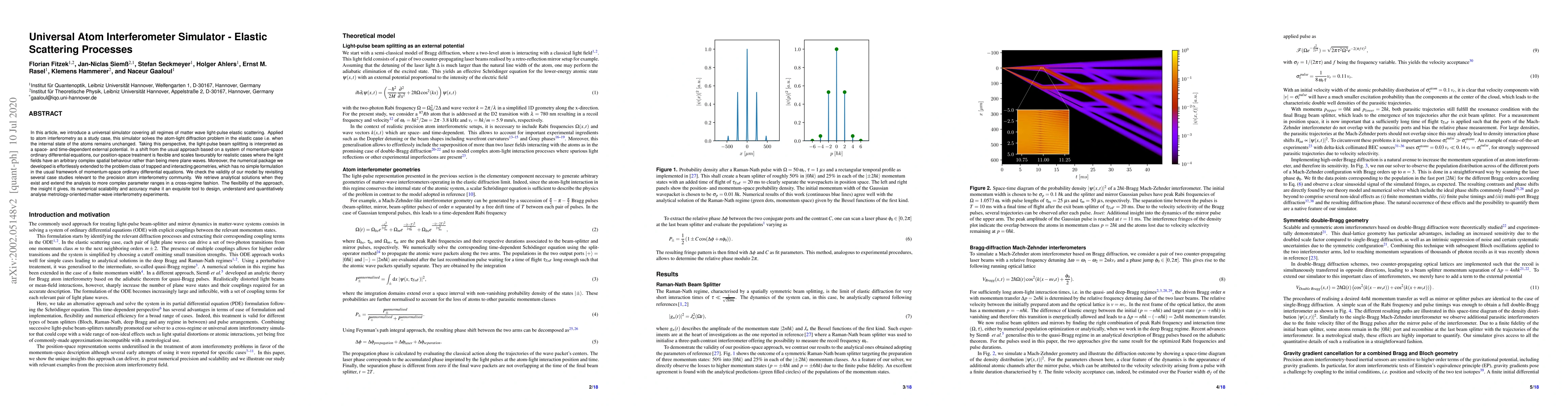 This research introduces a universal simulator for elastic scattering processes in atom interferometry, solving the problem of light-pulse beam splitting as a space- and time-dependent external potential, providing a flexible and scalable tool for designing and analyzing precision metrology experiments.