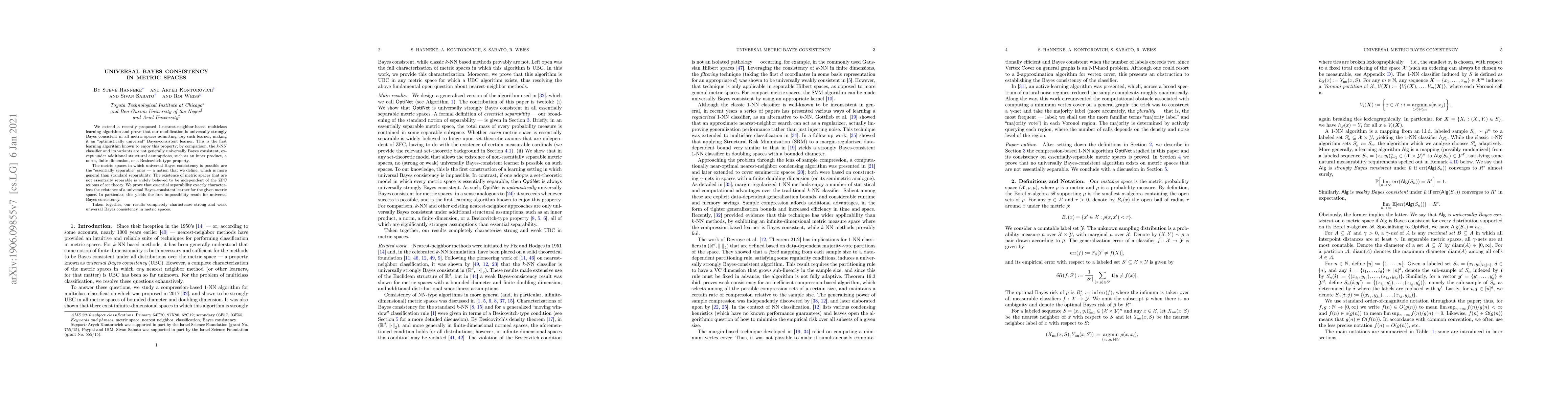This paper introduces a modified 1-nearest-neighbor learning algorithm that is universally strongly Bayes-consistent in "essentially separable" metric spaces, a broader class than standard separability. It establishes the first algorithm with this property and provides the first impossibility result for universal Bayes consistency.