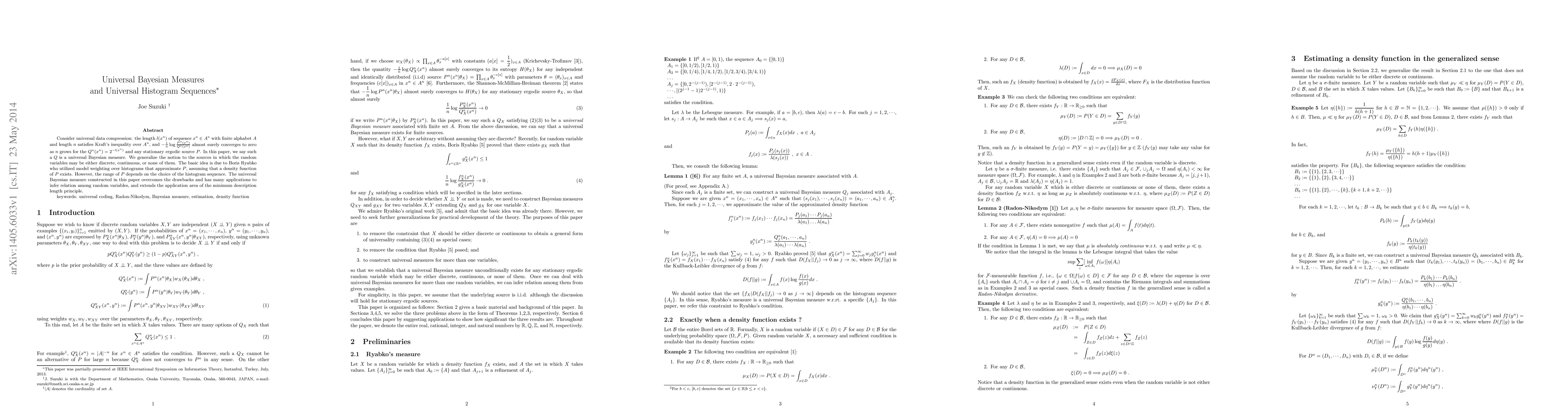 The paper extends Ryabko's universal measures to sources where random variables can be discrete, continuous, or neither, by utilizing model weighting over histograms approximating the source density. It constructs a universal Bayesian measure that overcomes previous drawbacks and has applications in inferring relations among random variables and extending the minimum description length principle.