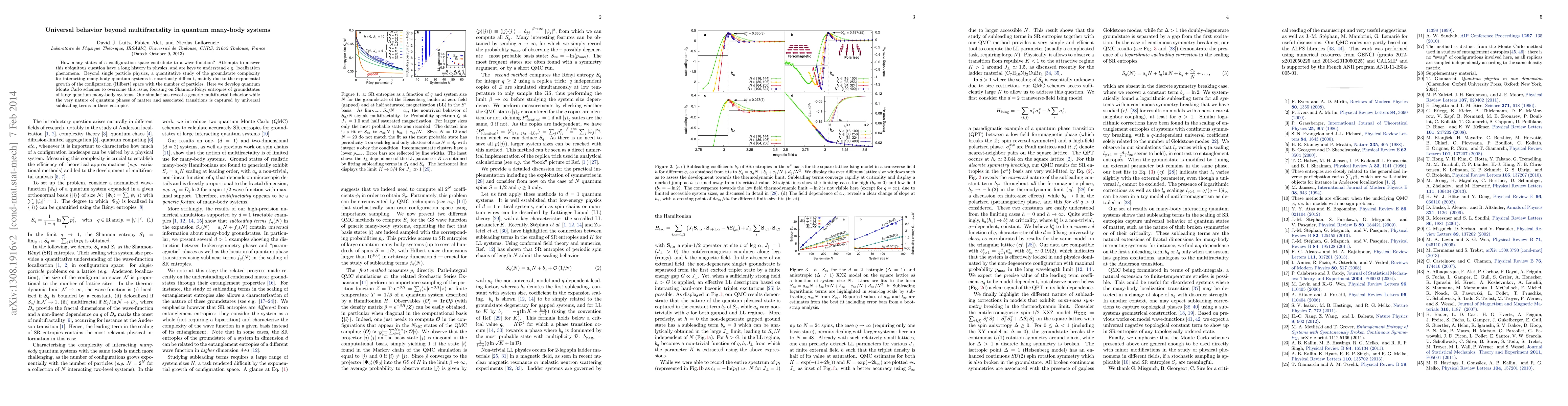 This paper introduces Monte Carlo methods to calculate Shannon-Renyi entropies for large quantum many-body systems, revealing universal subleading terms that capture the nature of quantum phases beyond multifractality. These findings provide new insights into the contribution of states in configuration space to wave-functions, crucial for understanding localization phenomena.