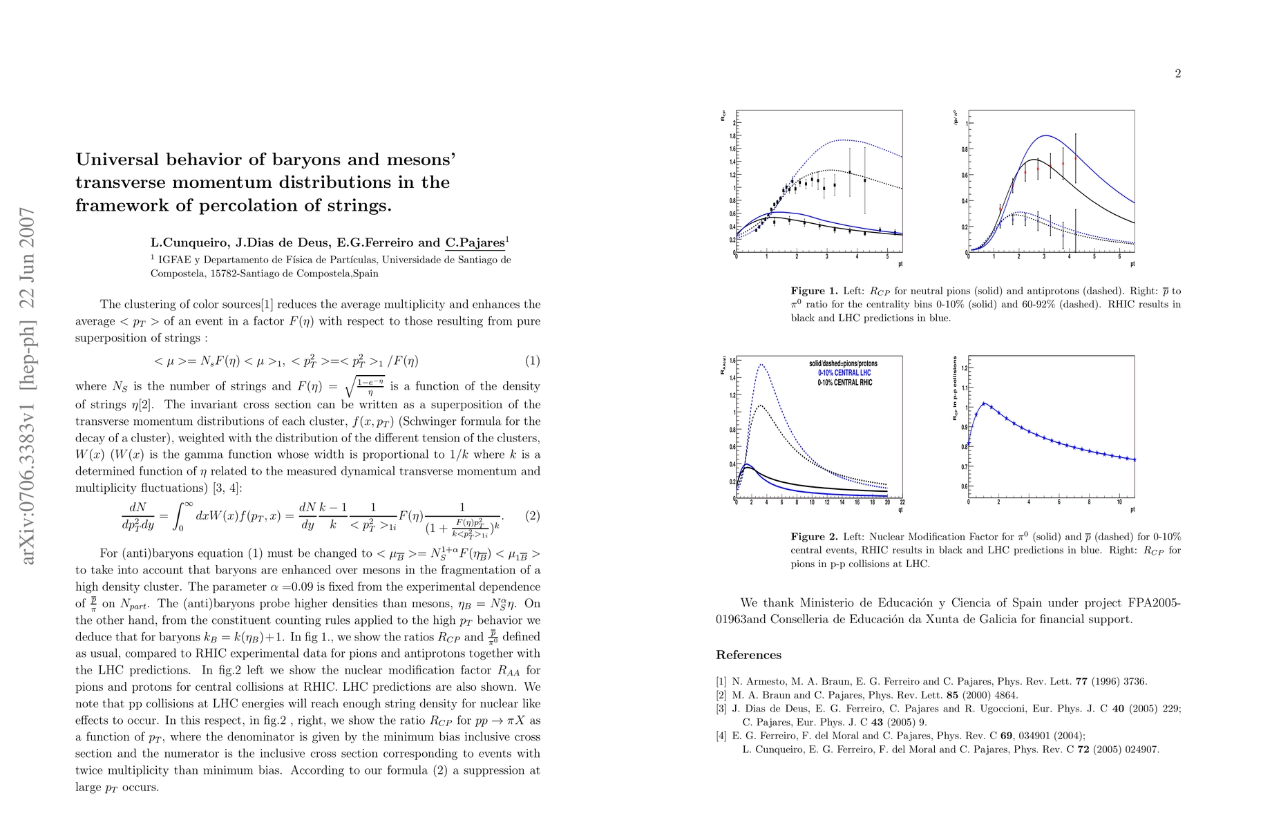 Summary: This paper explores the universal behavior of baryons and mesons' transverse momentum distributions using the percolation of strings model, predicting $R_{AA}$ and $R_{CP}$ values, as well as $\bar{p}/\pi^{0}$ ratios at LHC energies. The findings suggest a consistent pattern across different particle types.