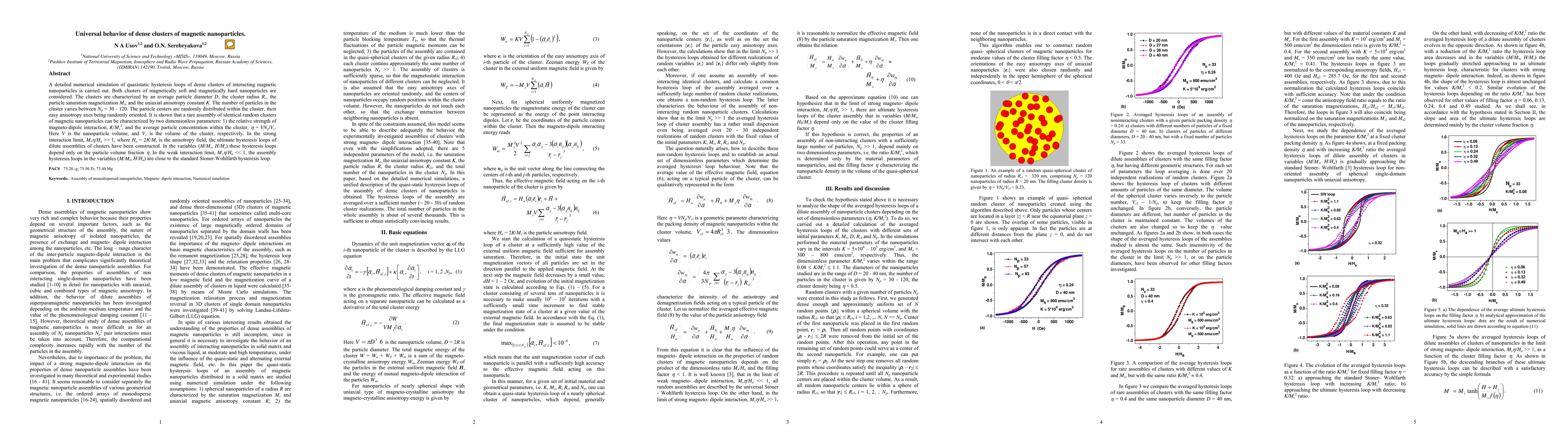 A detailed numerical simulation of quasistatic hysteresis loops of dense clusters of interacting magnetic nanoparticles is carried out. Both clusters of magnetically soft and magnetically hard nanoparticles are considered. The clusters are characterized by an average particle diameter D, the cluster radius Rc, the particle saturation magnetization Ms, and the uniaxial anisotropy constant K. The number of particles in the cluster varies between Np = 30 - 120. The particle centers are randomly distributed within the cluster, their easy anisotropy axes being randomly oriented. It is shown that a rare assembly of identical random clusters of magnetic nanoparticles can be characterized by two dimensionless parameters: 1) the relative strength of magneto-dipole interaction, K/Ms^2, and the average particle concentration within the cluster, {\eta} = VNp/Vc. Here V is the nanoparticle volume, and Vc is the volume of the cluster, respectively. In the strong interaction limit, Ms*{\eta}/Ha >> 1, where Ha = 2K/Ms is the anisotropy field, the ultimate hysteresis loops of dilute assemblies of clusters have been constructed. In the variables (M/Ms, H/Ms) these hysteresis loops depend only on the particle volume fraction {\eta}. In the weak interaction limit, Ms*{\eta}/Ha << 1, the assembly hysteresis loops in the variables (M/Ms, H/Ha) are close to the standard Stoner-Wohlfarth hysteresis loop.