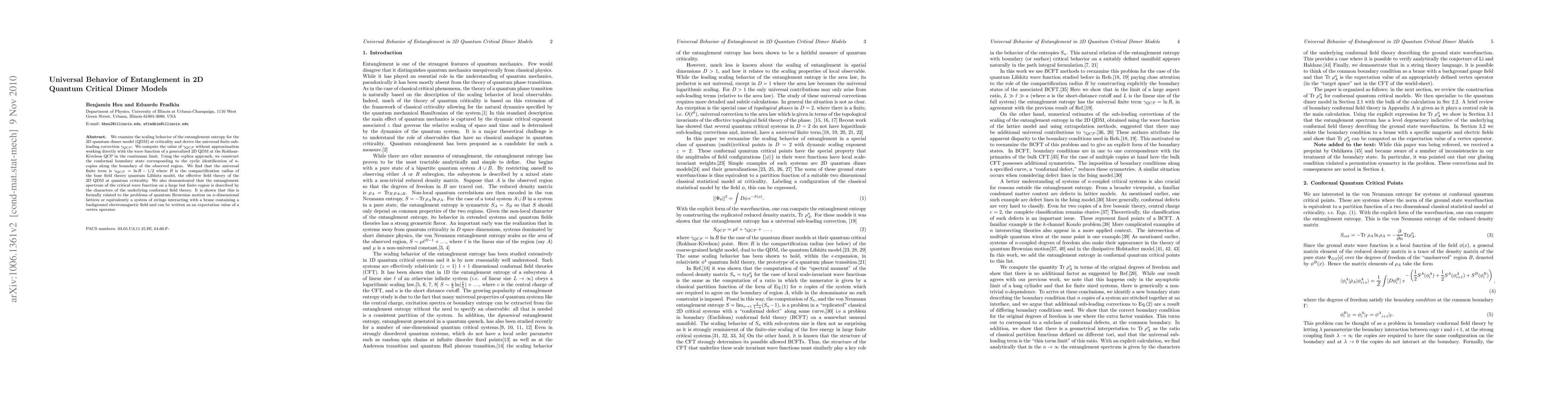 This paper investigates the entanglement entropy scaling behavior in 2D quantum dimer models at criticality, deriving a universal finite sub-leading correction $\gamma_{QCP}$. The study finds $\gamma_{QCP}=\ln R-1/2$, where $R$ is the compactification radius, and connects the entanglement spectrum to conformal field theory and quantum Brownian motion problems.