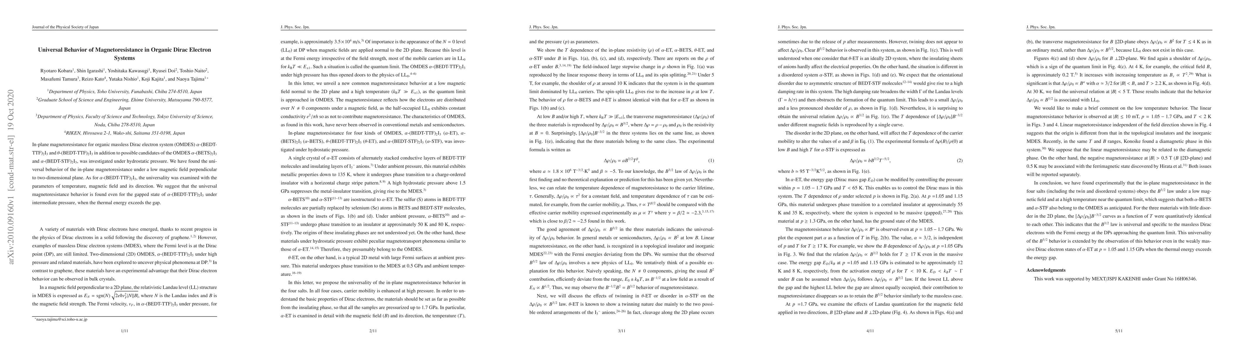 In-plane magnetoresistance for organic massless Dirac electron system (OMDES) $\alpha$-(BEDT-TTF)$_2$I$_3$ and $\theta$-(BEDT-TTF)$_2$I$_3$ in addition to possible candidates of the OMDES $\alpha$-(BETS)$_2$I$_3$ and $\alpha$-(BEDT-STF)$_2$I$_3$, was investigated under hydrostatic pressure. We have found the universal behavior of the in-plane magnetoresistance under a low magnetic field perpendicular to two-dimensional plane. As for $\alpha$-(BEDT-TTF)$_2$I$_3$, the universality was examined with the parameters of temperature, magnetic field and its direction. We suggest that the universal magnetoresistance behavior is found even for the gapped state of $\alpha$-(BEDT-TTF)$_2$I$_3$ under intermediate pressure, when the thermal energy exceeds the gap.